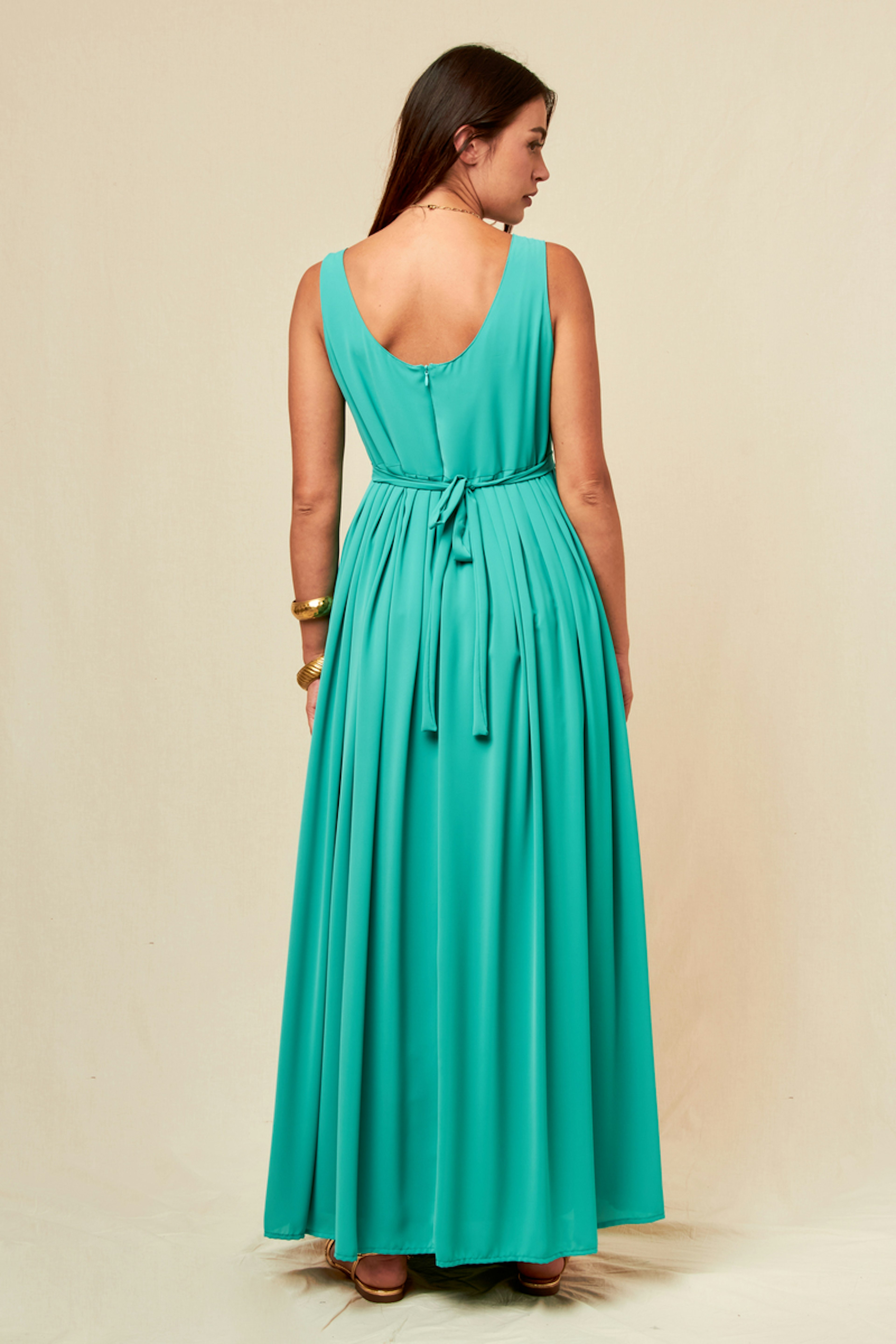 Perfect for a summer ceremony, pair this dress with golden sandals and an elegant clutch. • Long viscose dress • High waist detail • Discreet pleated front • Invisible zipper at the back • Tie belt at the back