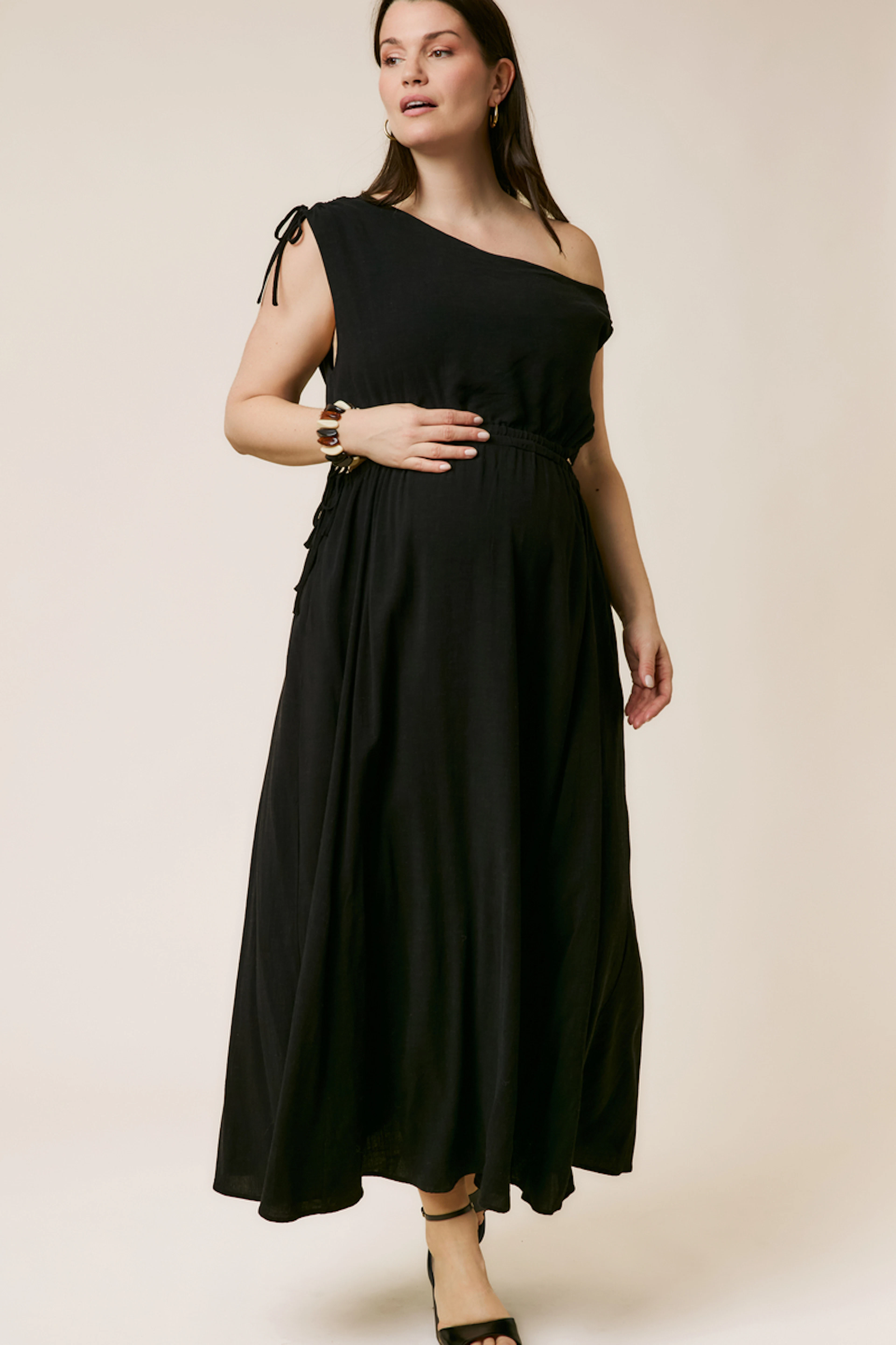 Pair this dress with golden sandals and a straw hat for a chic summer touch. • Long linen dress • Asymmetrical cut • Elastic waist • Off-the-shoulder • Tied details