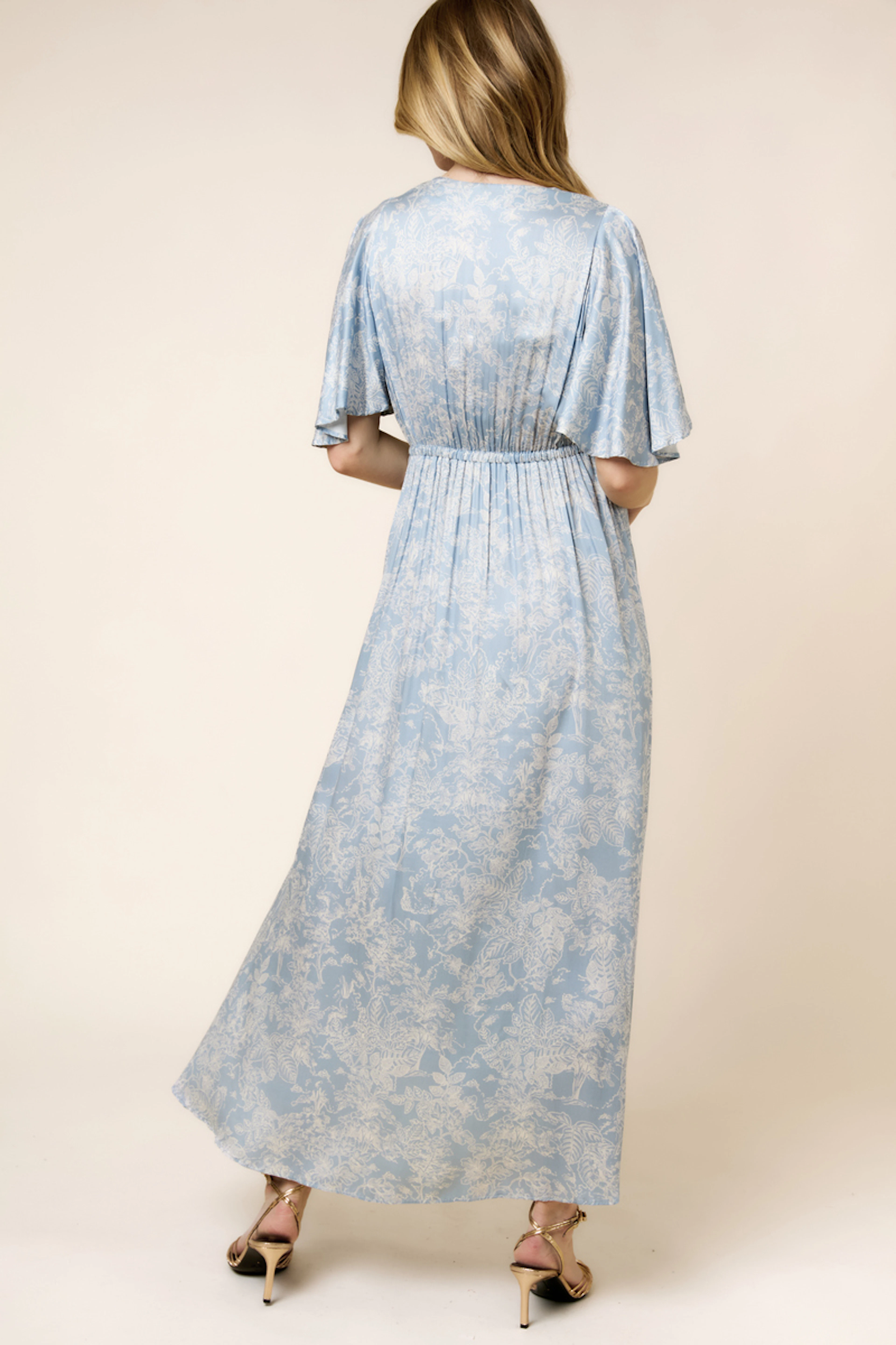 Wear this dress with golden sandals and a straw hat for a sophisticated summer touch. • Flowing long dress • Delicate flared sleeves • Elegant blue pattern • Flattering empire waist • Refined V-neckline