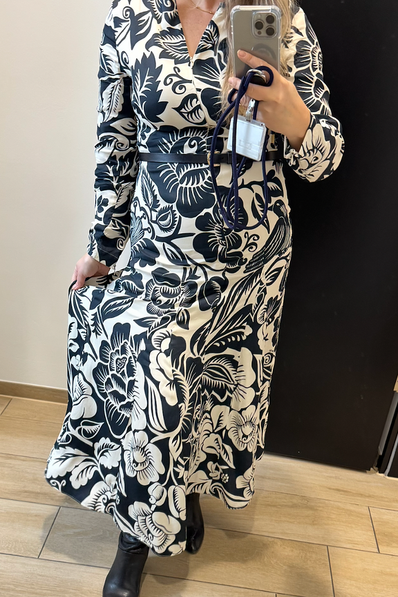 Pair this printed dress with black ankle boots and a delicate necklace for a chic and bold look, perfect in winter. • Long dress • Long sleeves • Fitted cut • Floral print • Round neckline