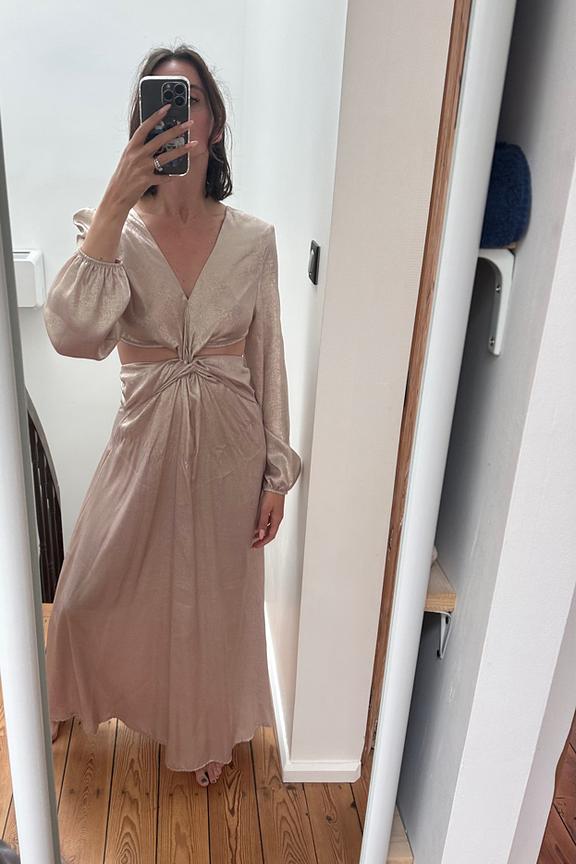 Combine this radiant dress with minimalist accessories for a sophisticated and contemporary look, ideal for any season. • Dress with deep neckline • Bow detail at the waist • Puffed sleeves • Elasticated cuff finishes • Elegant side opening