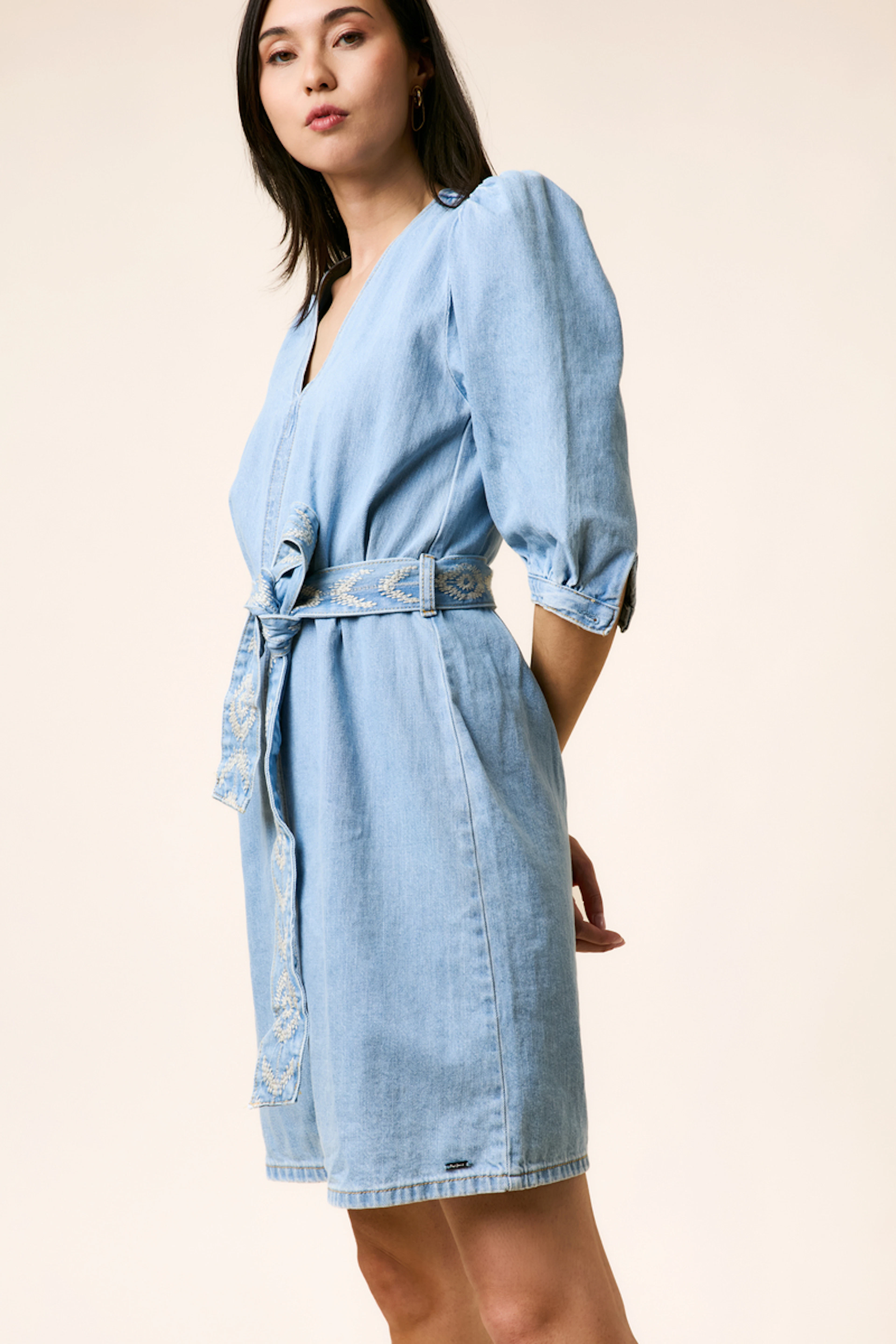 Add leather sandals and a woven bag for a summer look. • Short dress in cotton • V-neckline • Balloon sleeves • Tie belt • Subtle print on the belt