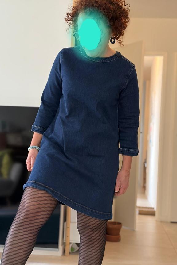 Add a fine belt and boots for a chic and casual look, perfect for any season. • A-line dress • Loose cut • 3/4 sleeves • Round neck • Blue denim