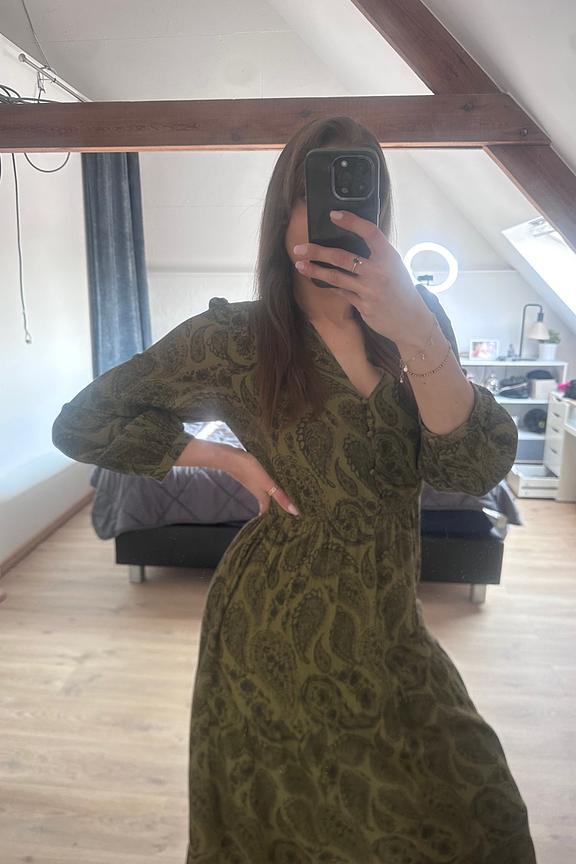 Style this dress with brown leather ankle boots and a wool coat for a chic winter look. • Long patterned dress • Subtle V-neck • Puffed long sleeves • Elastic waist • Elegant print