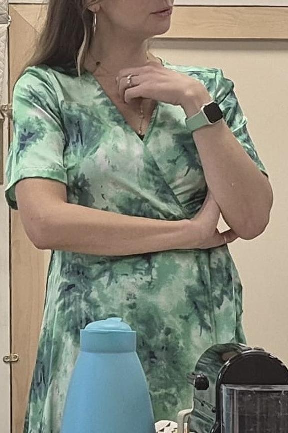 Tie-dye wrap dress • V-neck • Short sleeves • Cutline at the waist • Tie on the side • Trapeze dress • Classic cut • The model wears size 36 • The model is 165 cm tall