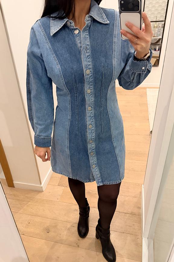Wear it with white booties and a straw hat for a refreshing summer look. • Denim dress • Straight cut • Long sleeves • Shirt collar • Buttons down the front