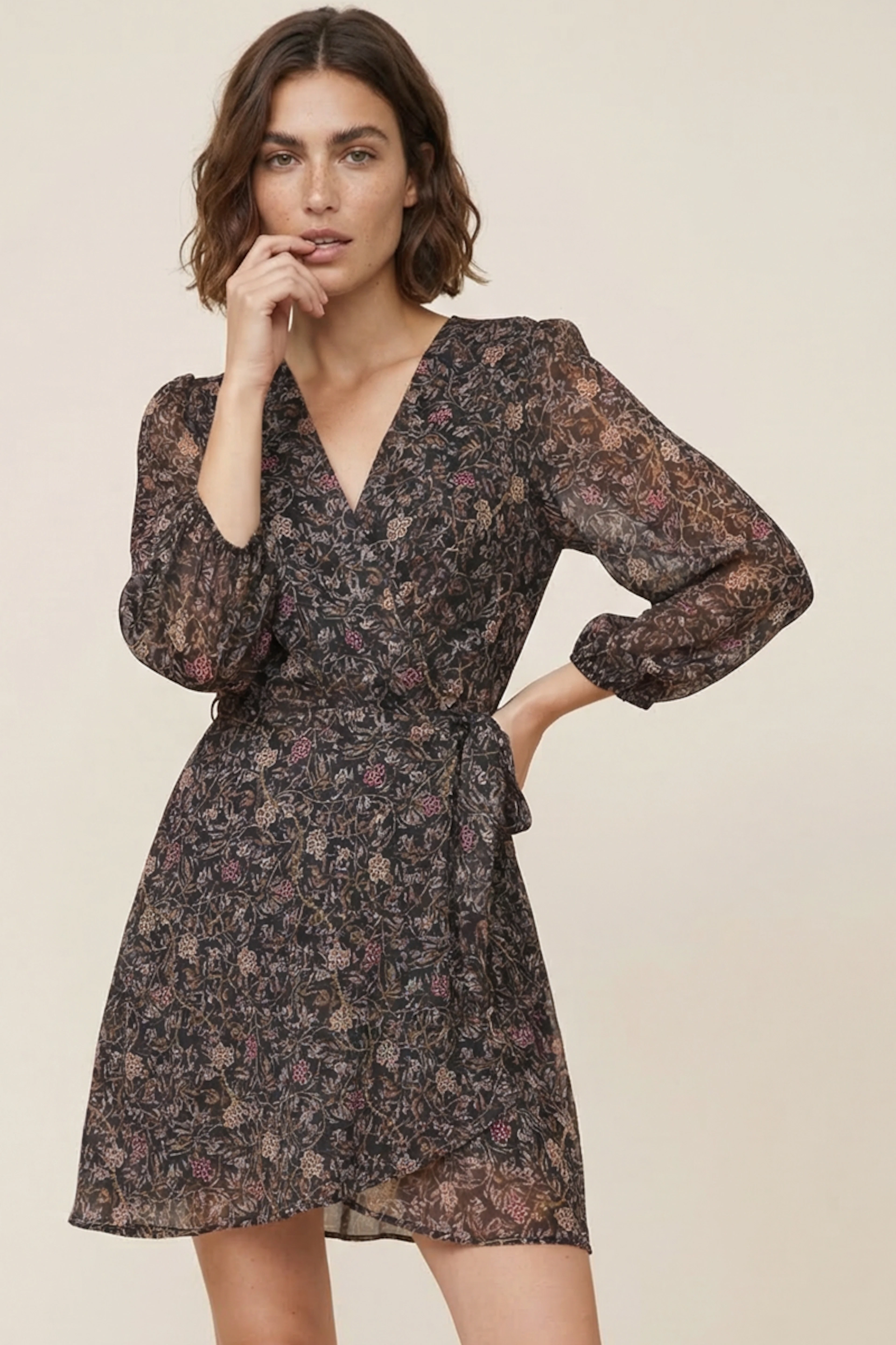Pair this wrap dress with leather boots for a relaxed chic look. Ideal in any season. • Short dress • Long sleeves • V-neck • Floral print • Tie belt