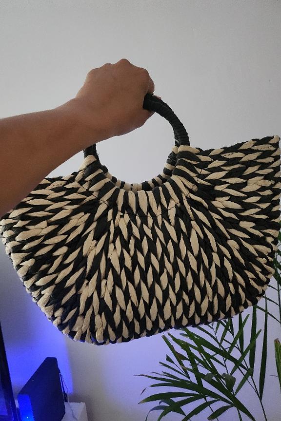 Add a natural touch to your outfit with this straw bag. It perfectly matches a summer dress or casual jeans for a chic simplicity look. • Woven straw bag • Half-moon shape • Rigid round handles • Two-tone pattern • Timeless artisanal style