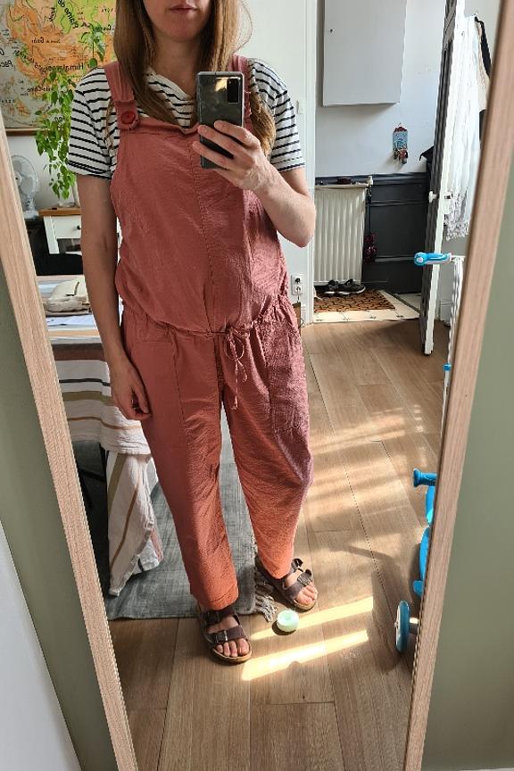 “Not very flattering, I probably should have taken a size down, but as I had tried on the pants from the same brand which run very small, I took a little larger. I usually wear size 38/40 on top and 36/38 on the bottom. The seams at the buttonholes of the overalls are not very strong and fray.”