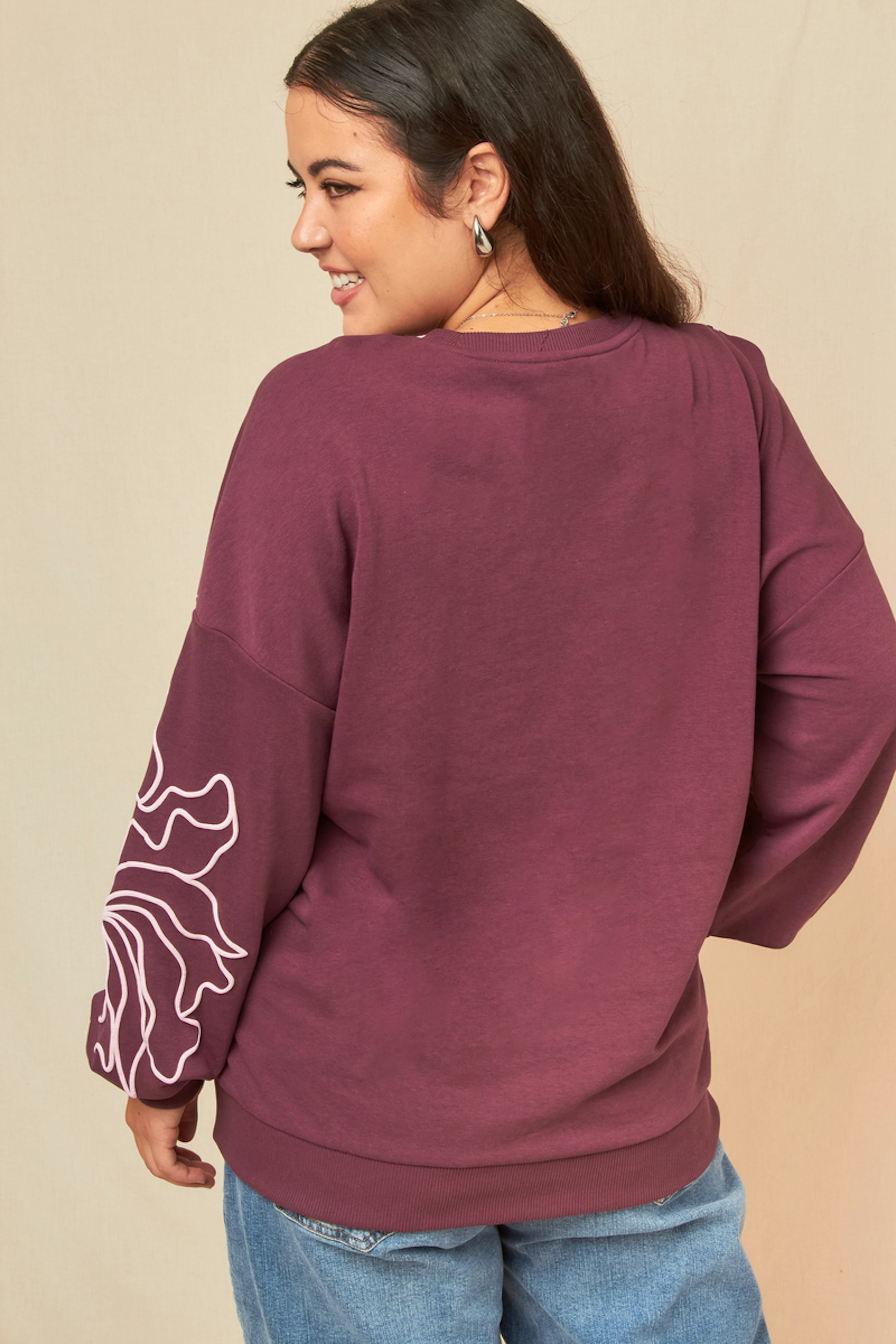 Combine this purple sweater with casual jeans and white sneakers for a chic and comfy look. Perfect for all seasons. • Cotton sweater • Loose fit • Long sleeves • Floral pattern • Round neck