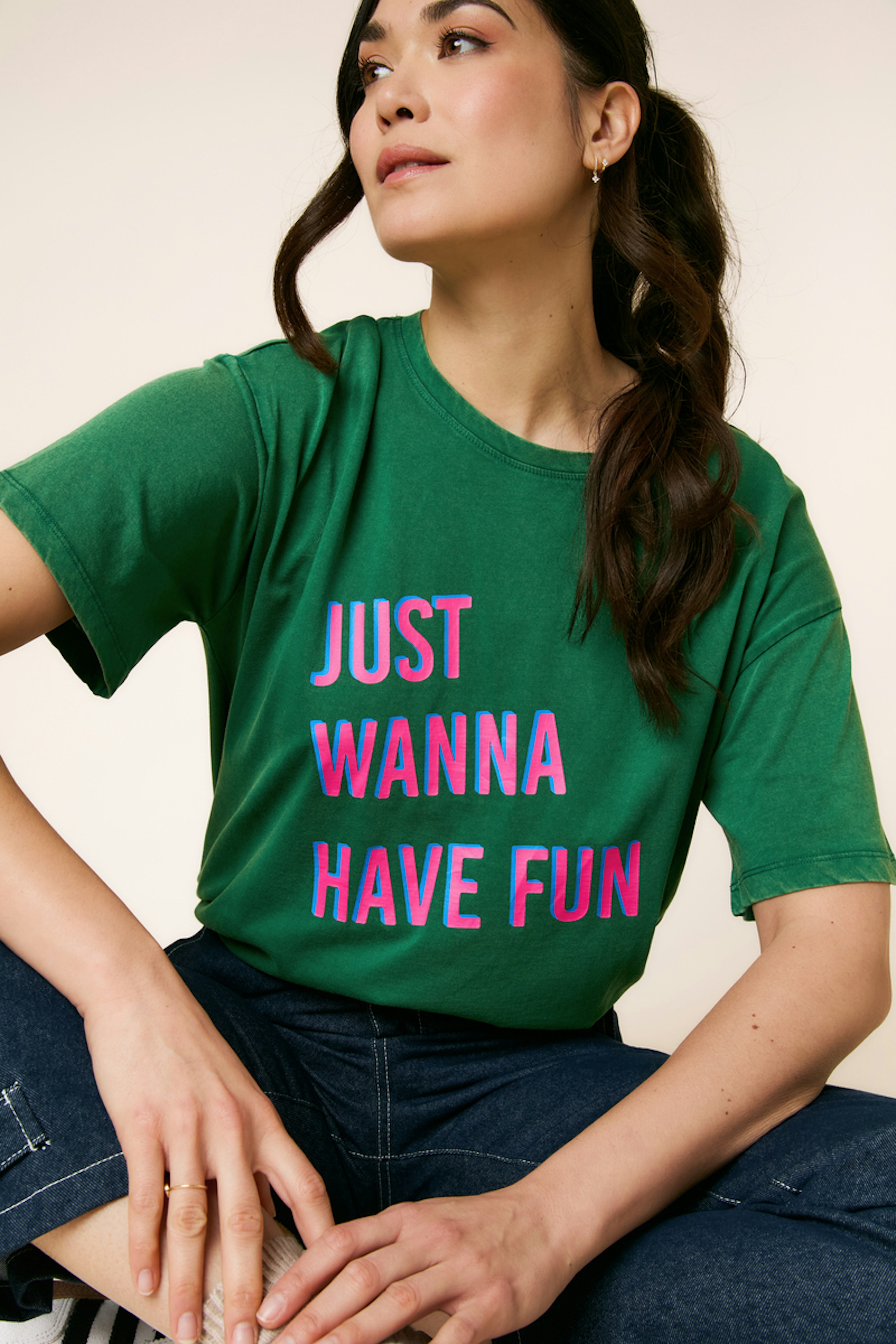 Wear this tee shirt with high-waisted shorts for a laid-back and stylish summer outfit. • Cotton tee shirt • Fun print • Short sleeves • Comfortable fit • Classic round neck