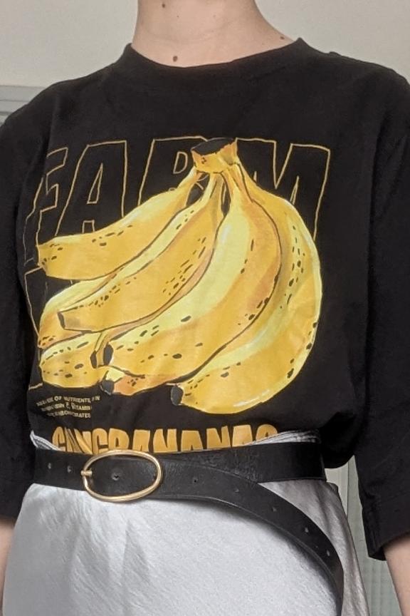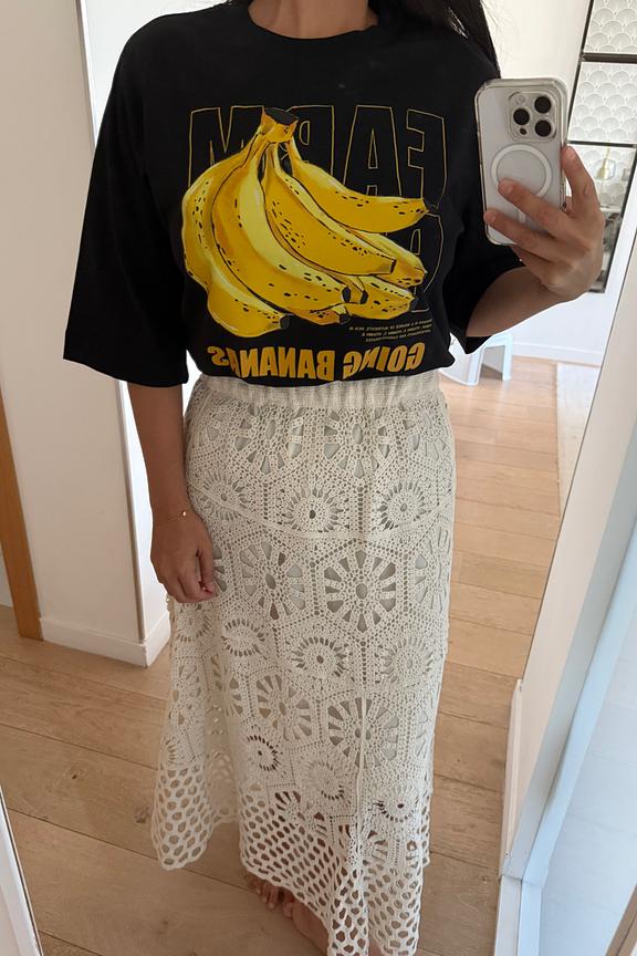 Pair this t-shirt with high-waisted jeans and white sneakers for a casual and vibrant look in any season. • 100% cotton t-shirt • Classic round neck • Rollable sleeves • Bright banana print • Comfortable and relaxed fit