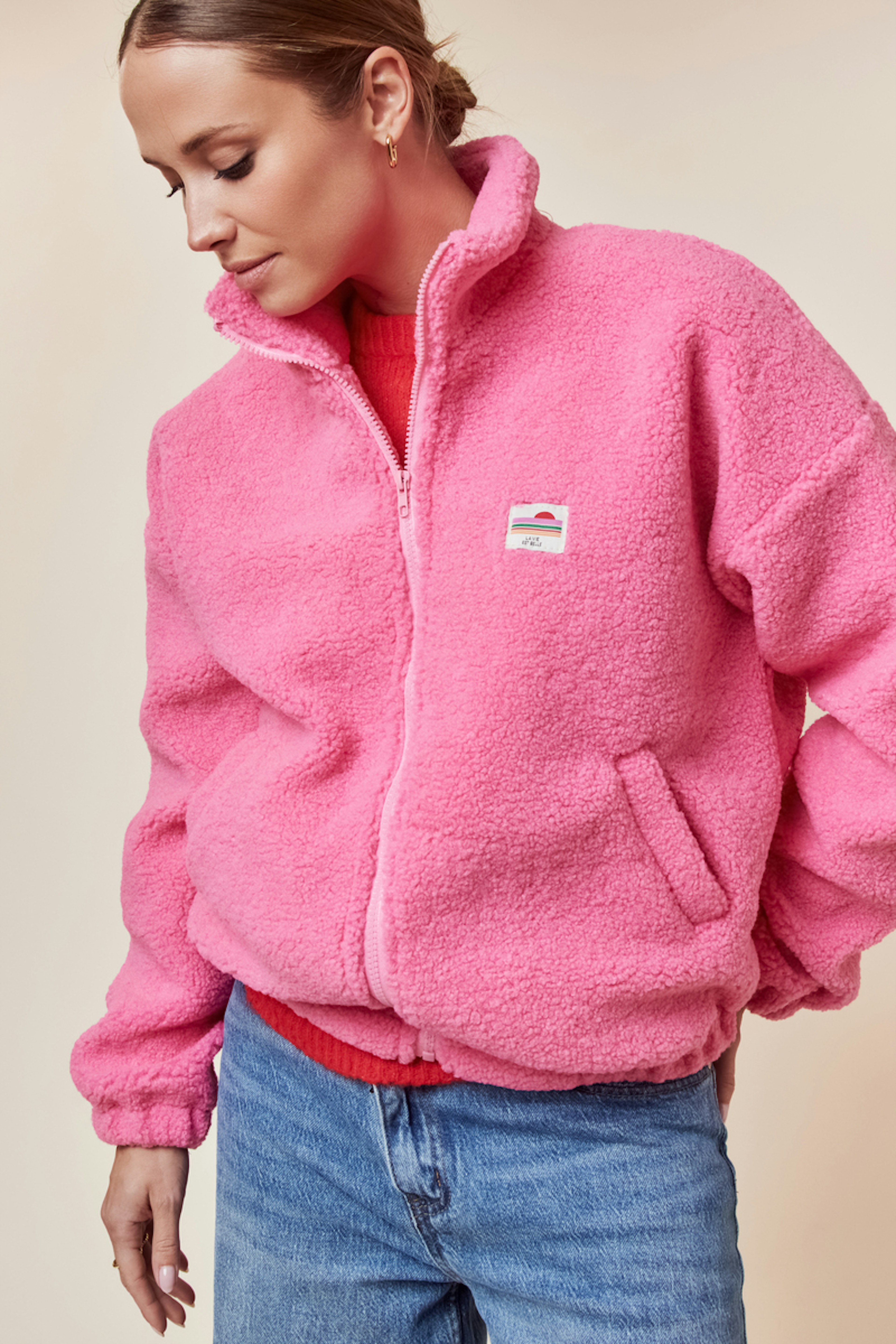 Add a fun twist to your look by pairing this jacket with high-waisted jeans and ankle boots. Perfect for facing those chilly days. • Cozy jacket • Oversized fit • Front zipper • Long sleeves • Solid pattern