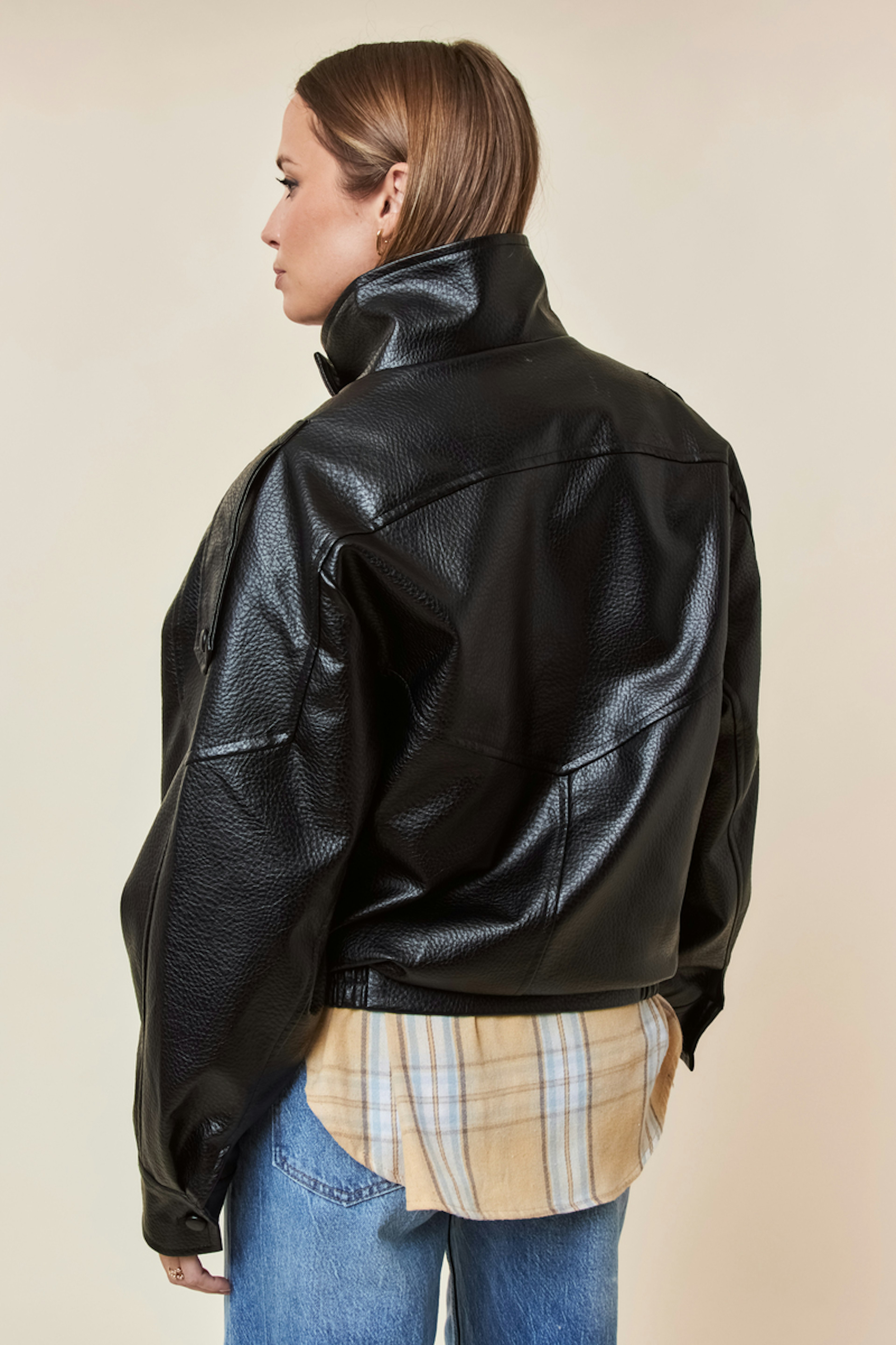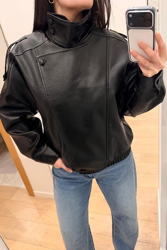This elegant black jacket is perfect for a modern look paired with slim jeans and ankle boots. Ideal for winter for a chic and bold vibe. • Faux leather jacket • High collar • Reinforced shoulders • Button closure • Textured fabric