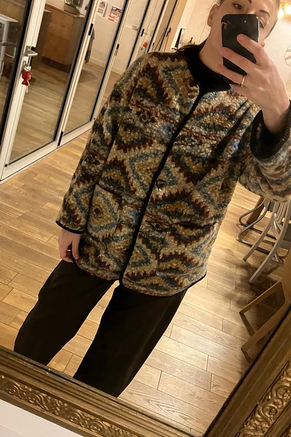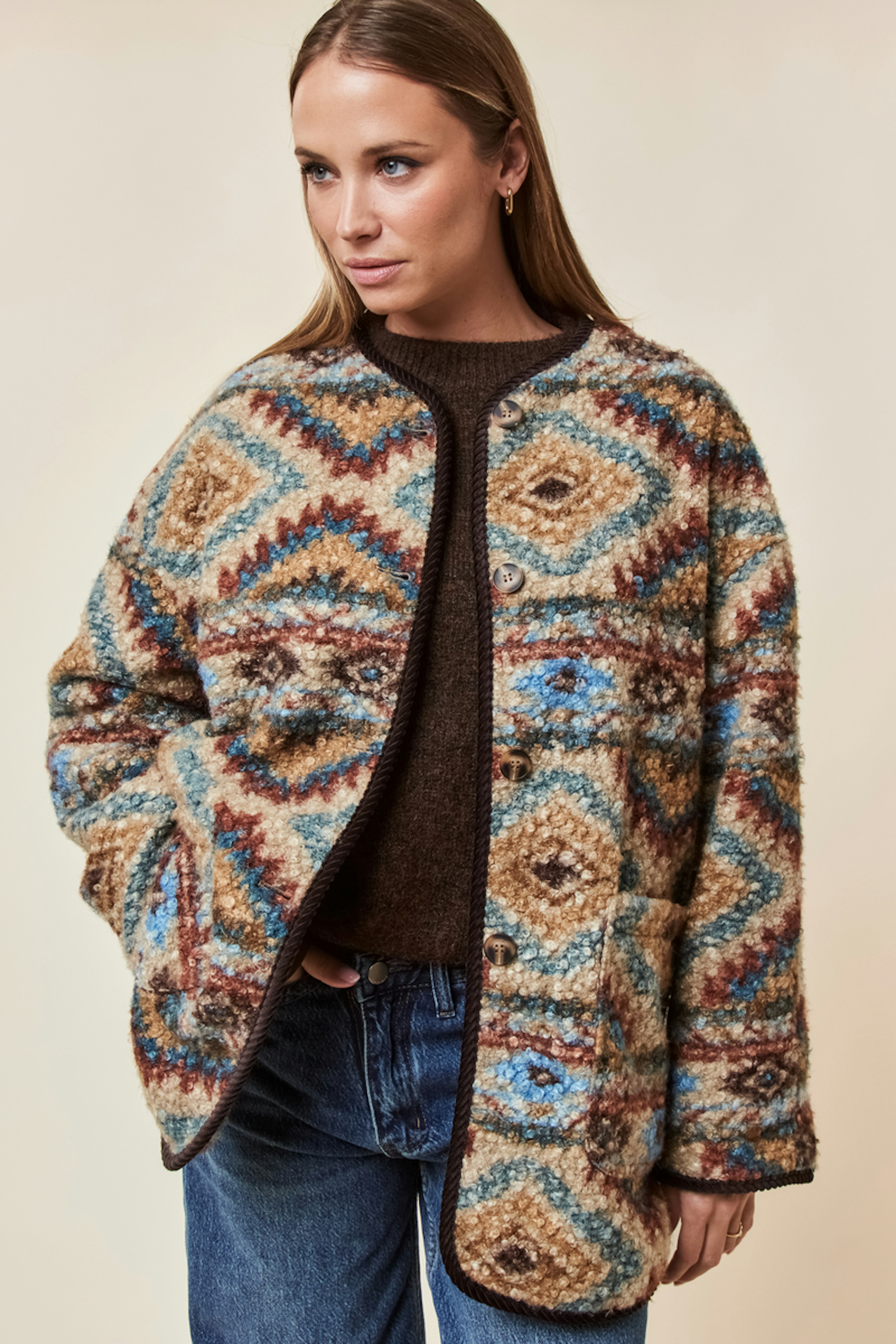 For a chic and laid-back vibe, pair this jacket with straight jeans and leather ankle boots. Perfect for warming up your winter days in style. • Printed jacket • Loose fit • Long sleeves • Button closure • Geometric pattern