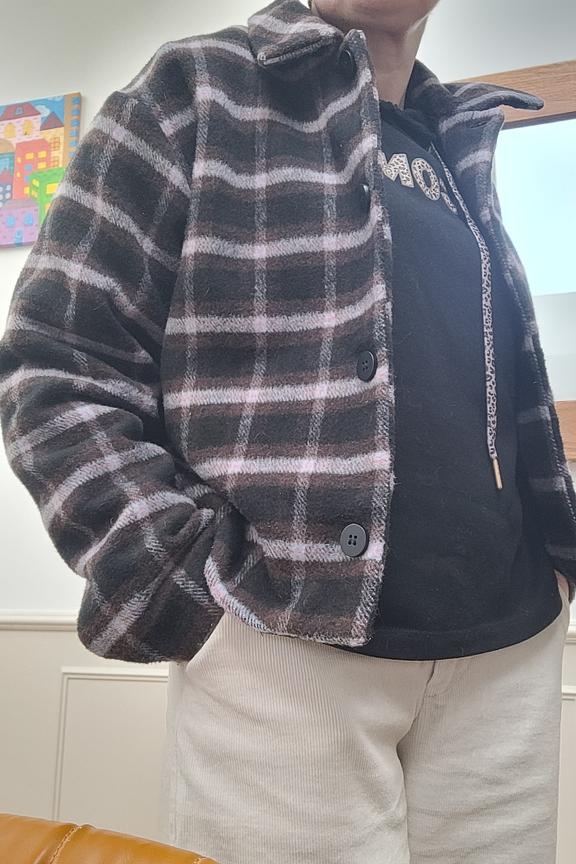 Pair this jacket with a colorful pull and high-waisted jeans for a chic winter look. • Checked pattern jacket • Short cut • Long sleeves • Classic collar • Visible buttons