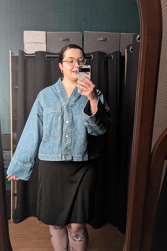 Add a white turtleneck and black pants for a perfect chic look all season long. • Short denim jacket • V-neck • Long sleeves • Button closure • Chest patch pocket