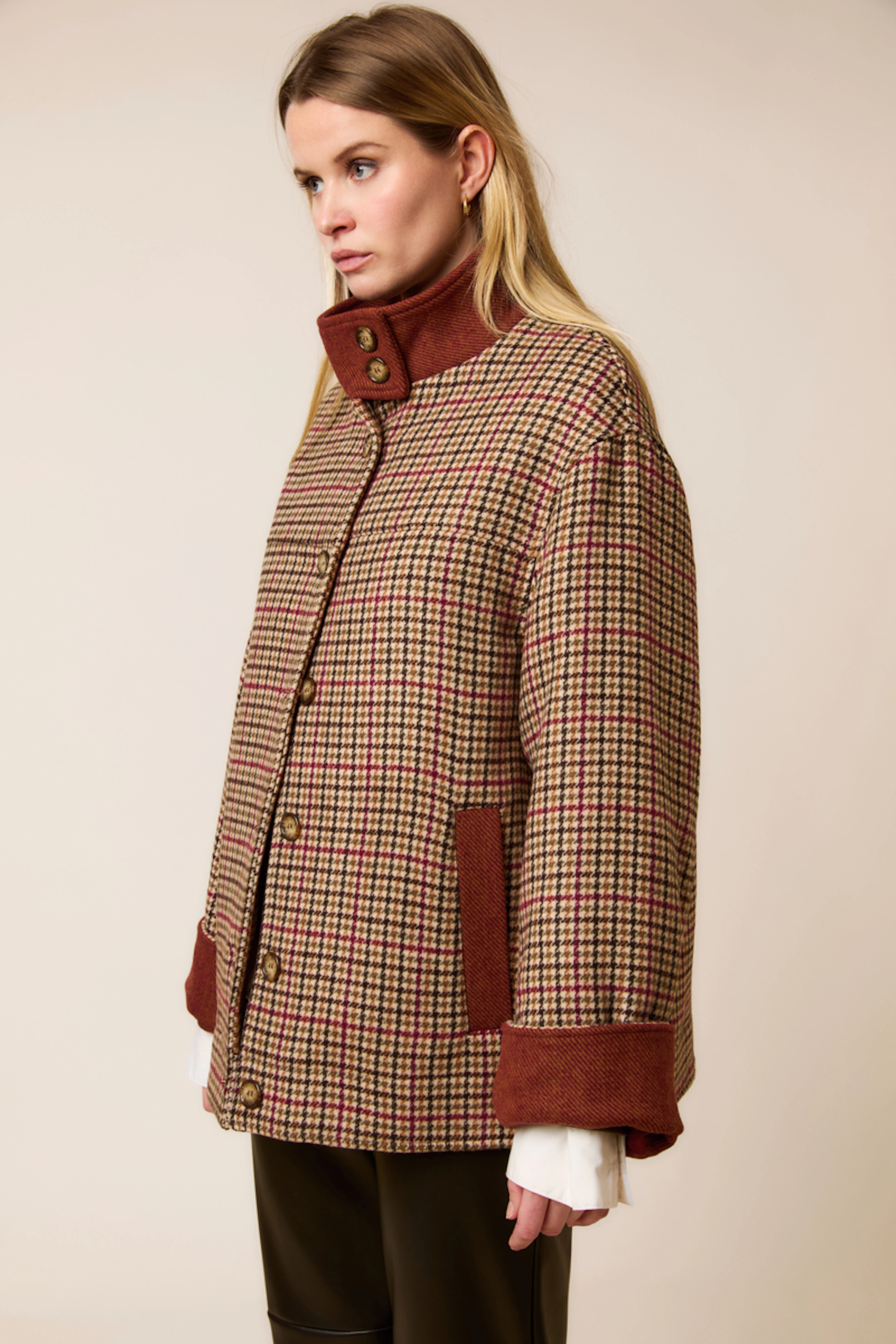 Pair this chic jacket with some slim jeans and leather booties for a fab winter look. • Houndstooth patterned jacket • High collar with decorative buttons • Long sleeves with contrasting cuffs • Button closure at the front • Stylish patch pockets