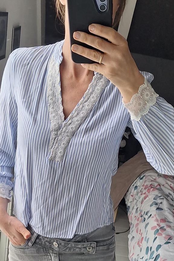 Combineer dit elegante overhemd met een jeans met hoge taille en enkellaarsjes voor een smart-casual look. Perfect voor alle seizoenen. - Gestreept overhemd - Mao kraag - Lange mouwen - Kanten details - Recht model