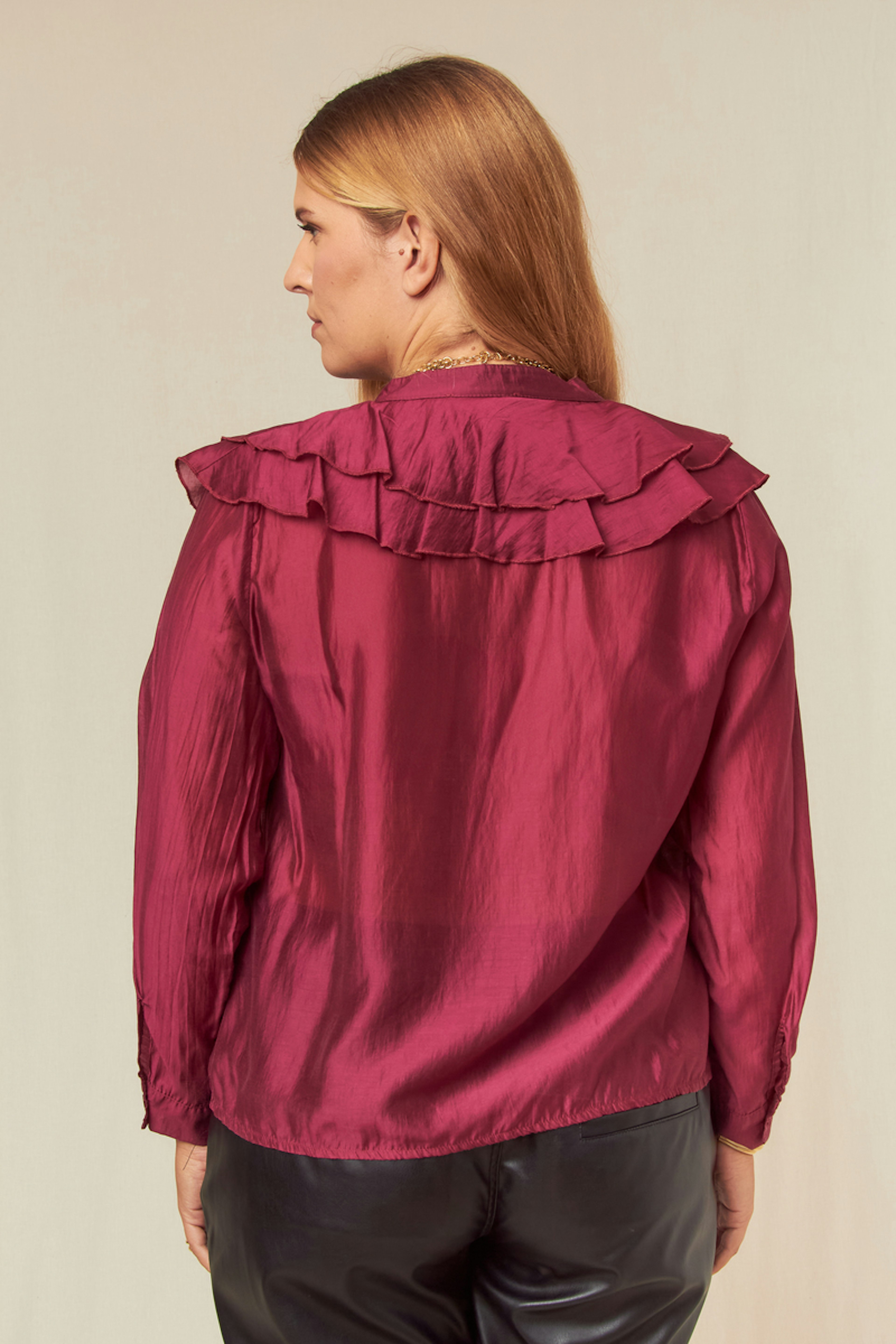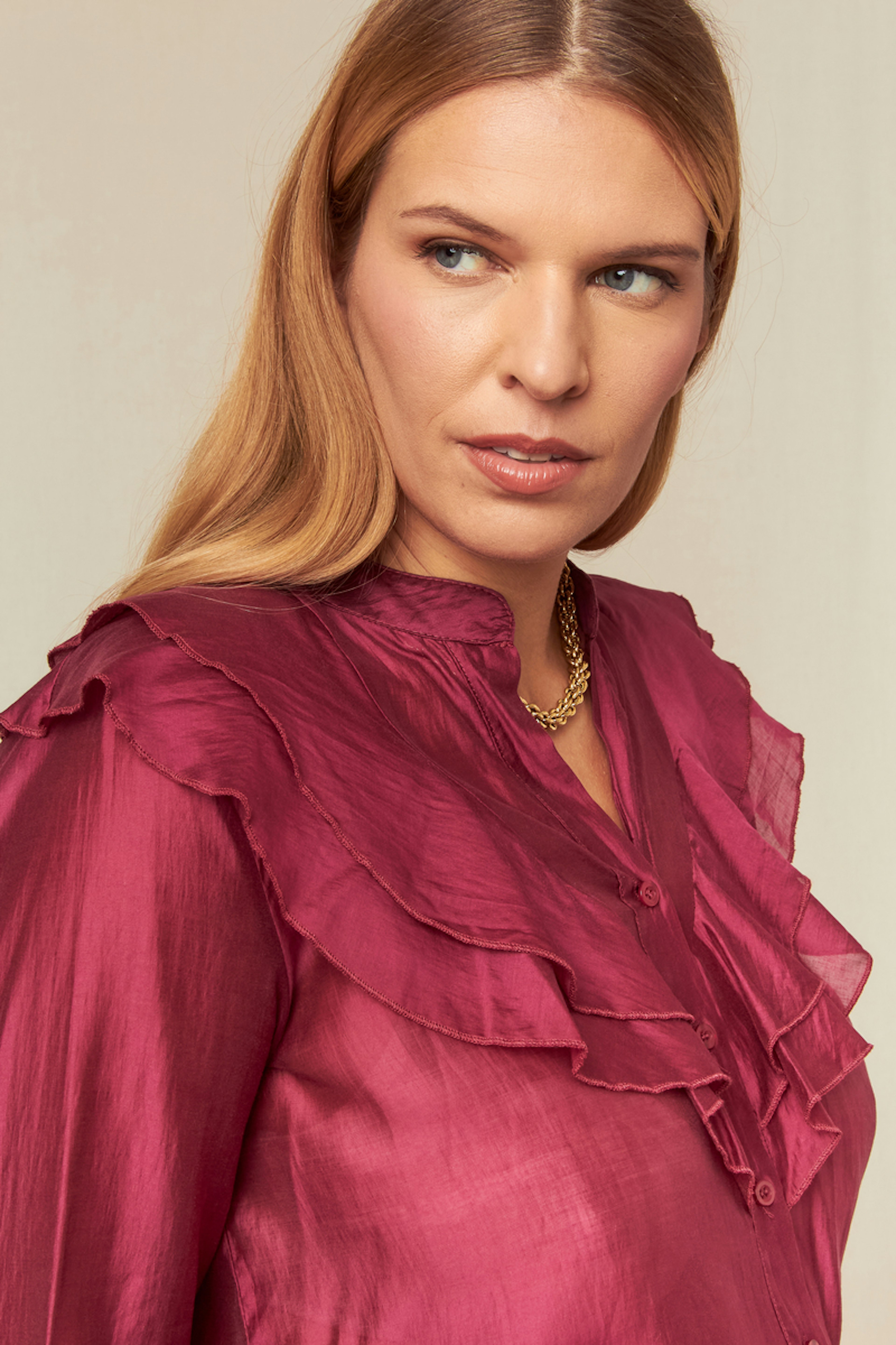 Combineer deze lichtgewicht blouse met een skinny jeans voor een chique zomerse look, of kies voor een kokerrok voor extra raffinement. - Losvallende blouse - Kraagloos - Lange mouwen - Elegante ruches - Knopen in het midden