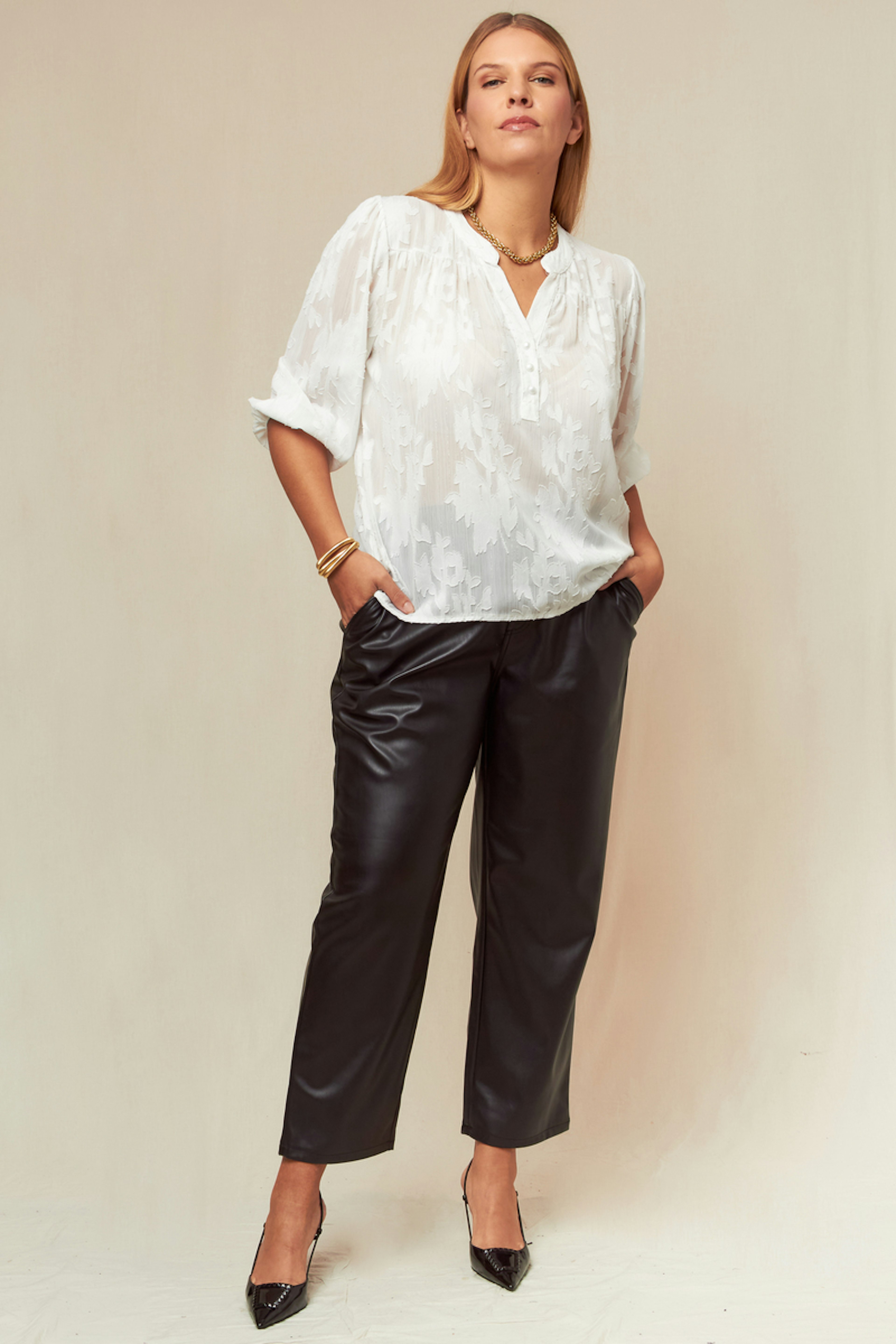Combineer deze blouse met een slim-fit broek voor een elegante look. Ideaal voor zomerse dagen wanneer stijl en comfort essentieel zijn. - Blouse met pofmouwen - Lichte, luchtige textuur - Halslijn met knoop - Reliëfpatroon - Subtiele glans
