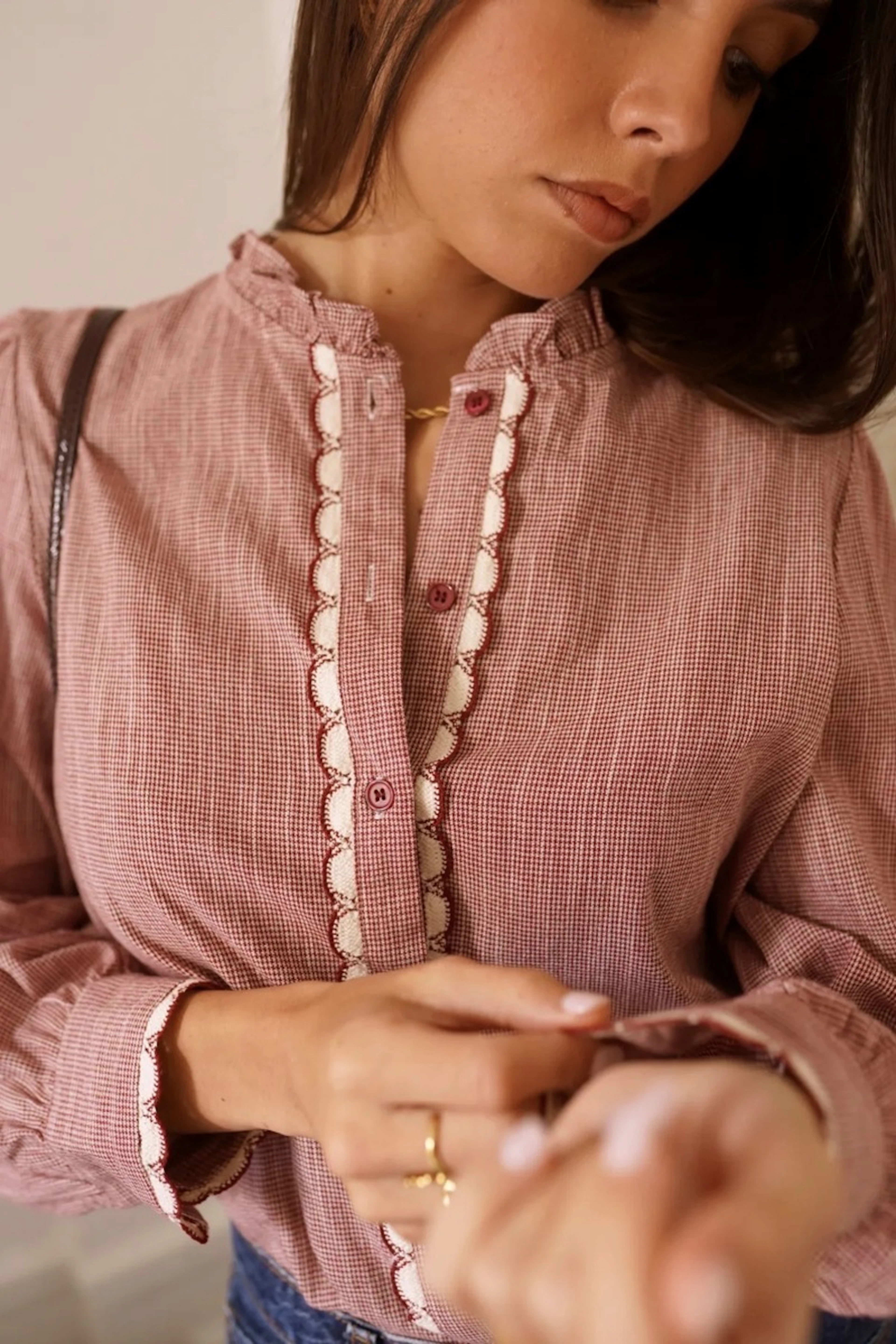 Combineer dit overhemd met een hoge taille jeans en laarzen voor een chique en vrijetijdslook, perfect voor de winter. • Overhemd van 100% katoen • Rechte pasvorm • Lange mouwen • Delicaat ronde hals • Elegante contrasterende knopen