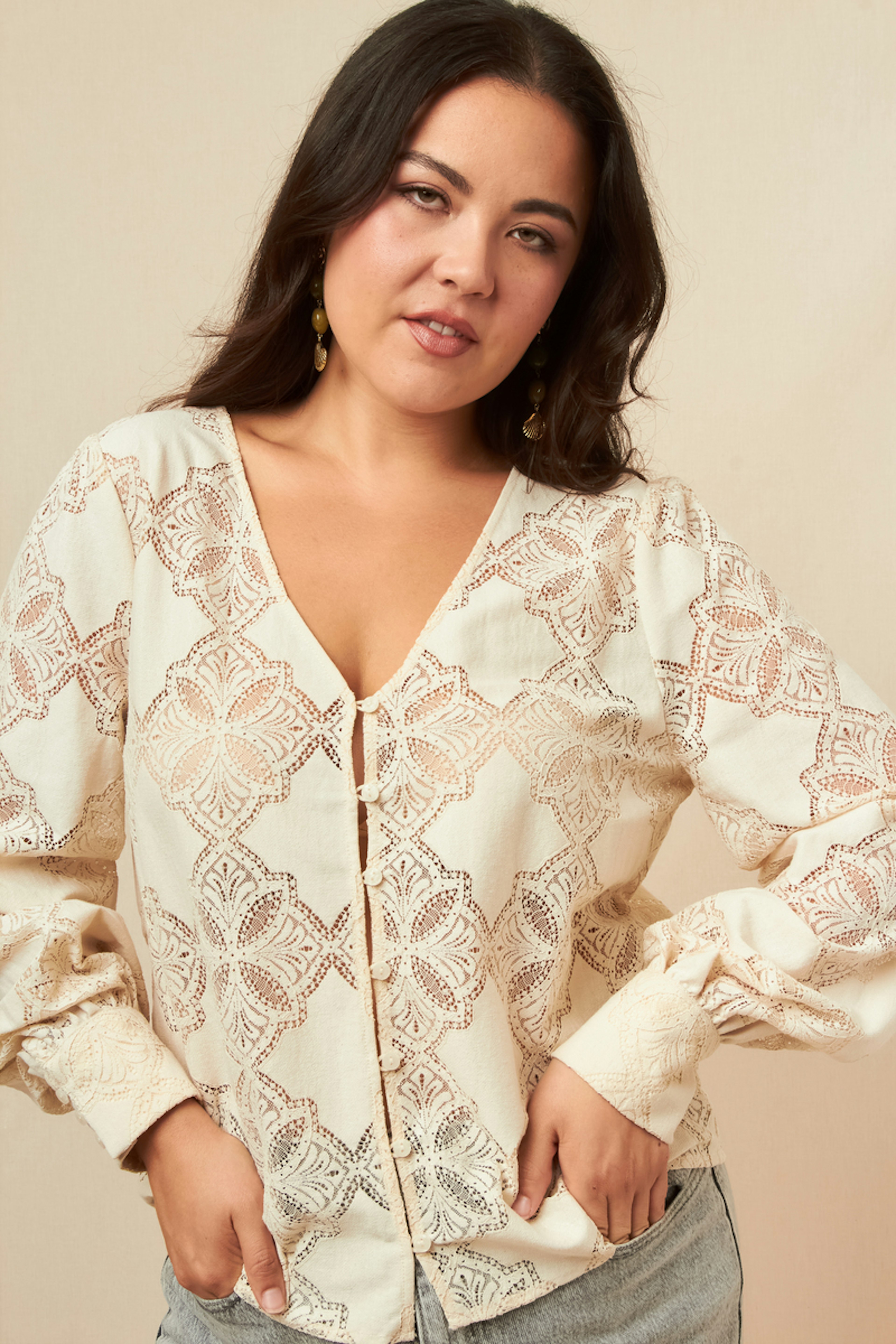 Geef je stijl een bohemienachtige touch door deze trui te combineren met een flare jeans en camelkleurige enkellaarsjes voor een chique winterlook. - Opengewerkte trui - Losse pasvorm - Lange mouwen - V-hals - Bloemen motief
