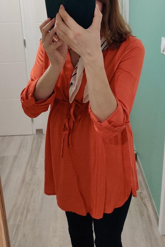 Het is een beetje groot, ik heb een dikke buik met 8 maanden en ik was wijd. Comfortabel materiaal maar moet gestreken worden. De kleur is niet zo oranje als op de foto maar meer terracotta of vervaagd oranje." "
