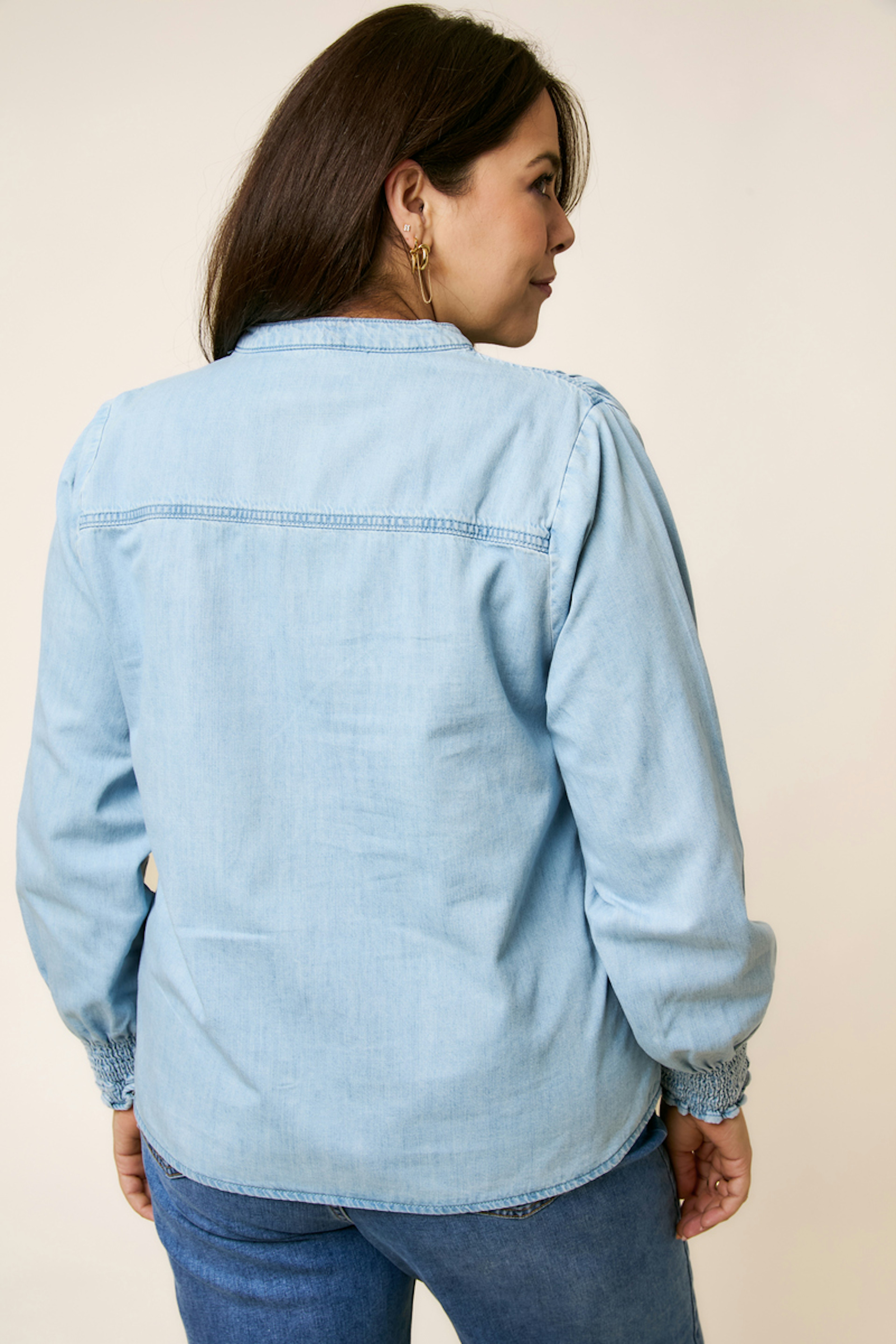 Draag deze blouse met een zwarte jeans en enkellaarsjes voor een chique winterlook. • Katoenen blouse • V-hals • Lange pofmouwen • Gathered polsen • Zachte blauwe tint
