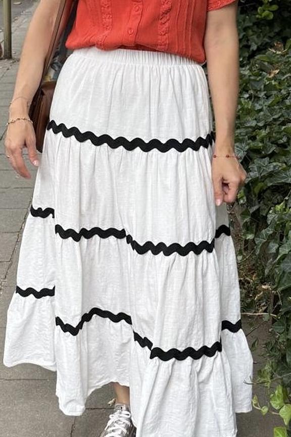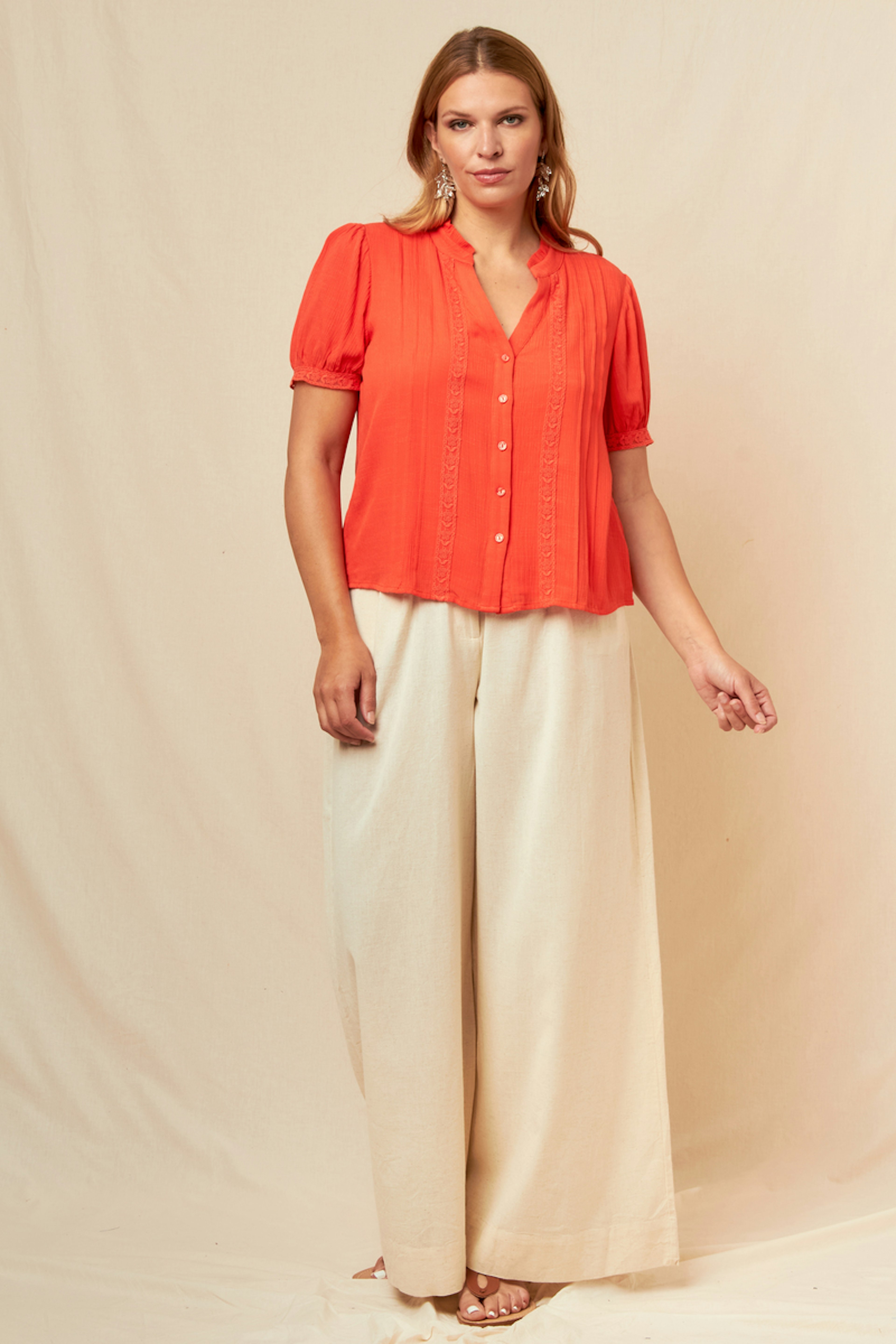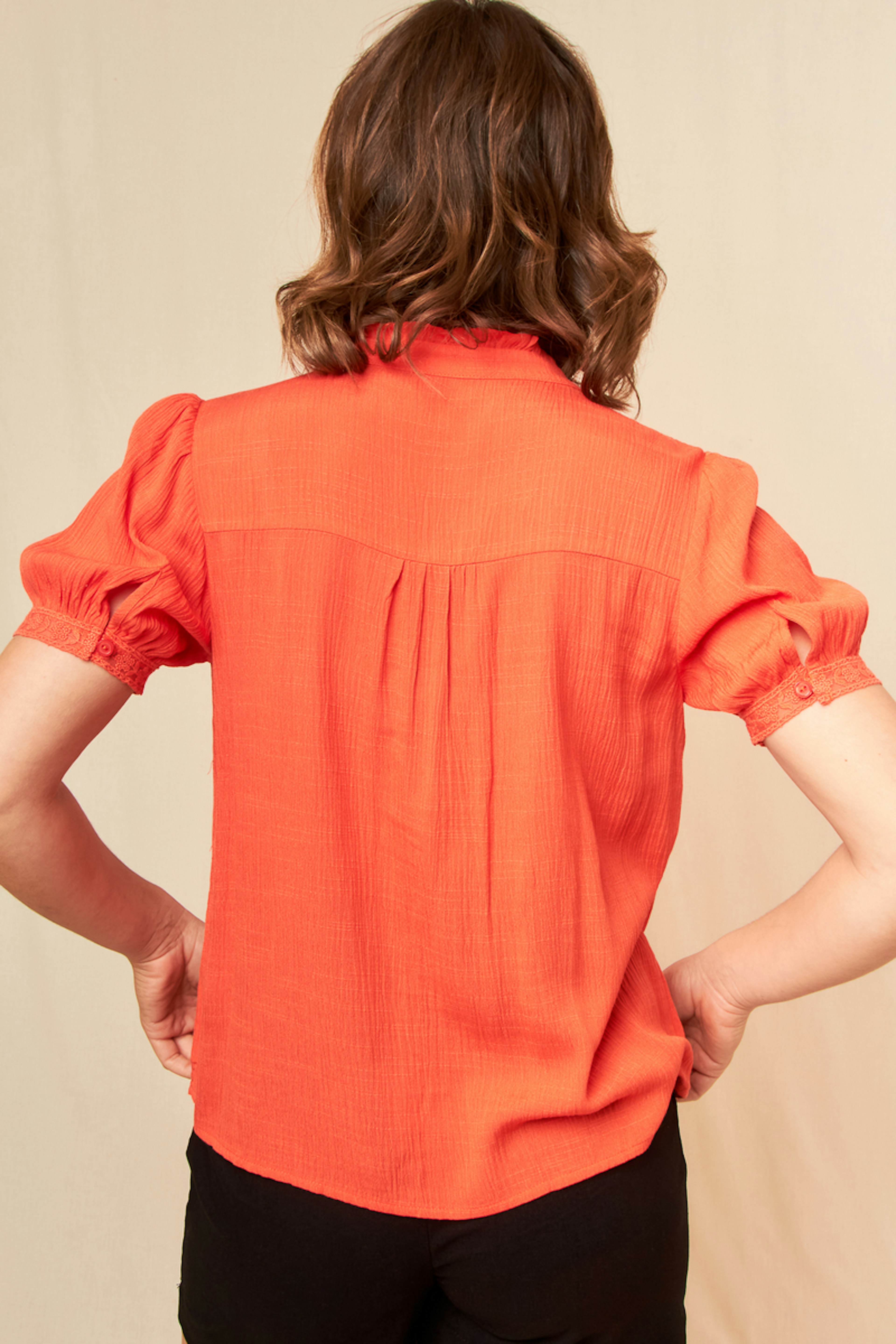 Combineer deze blouse met een elegante witte broek en sandalen voor een chique zomerse look. - Katoenen blouse - Korte pofmouwen - Hoge kraag met knoopsluiting - Kanten detail - Knopen in het midden