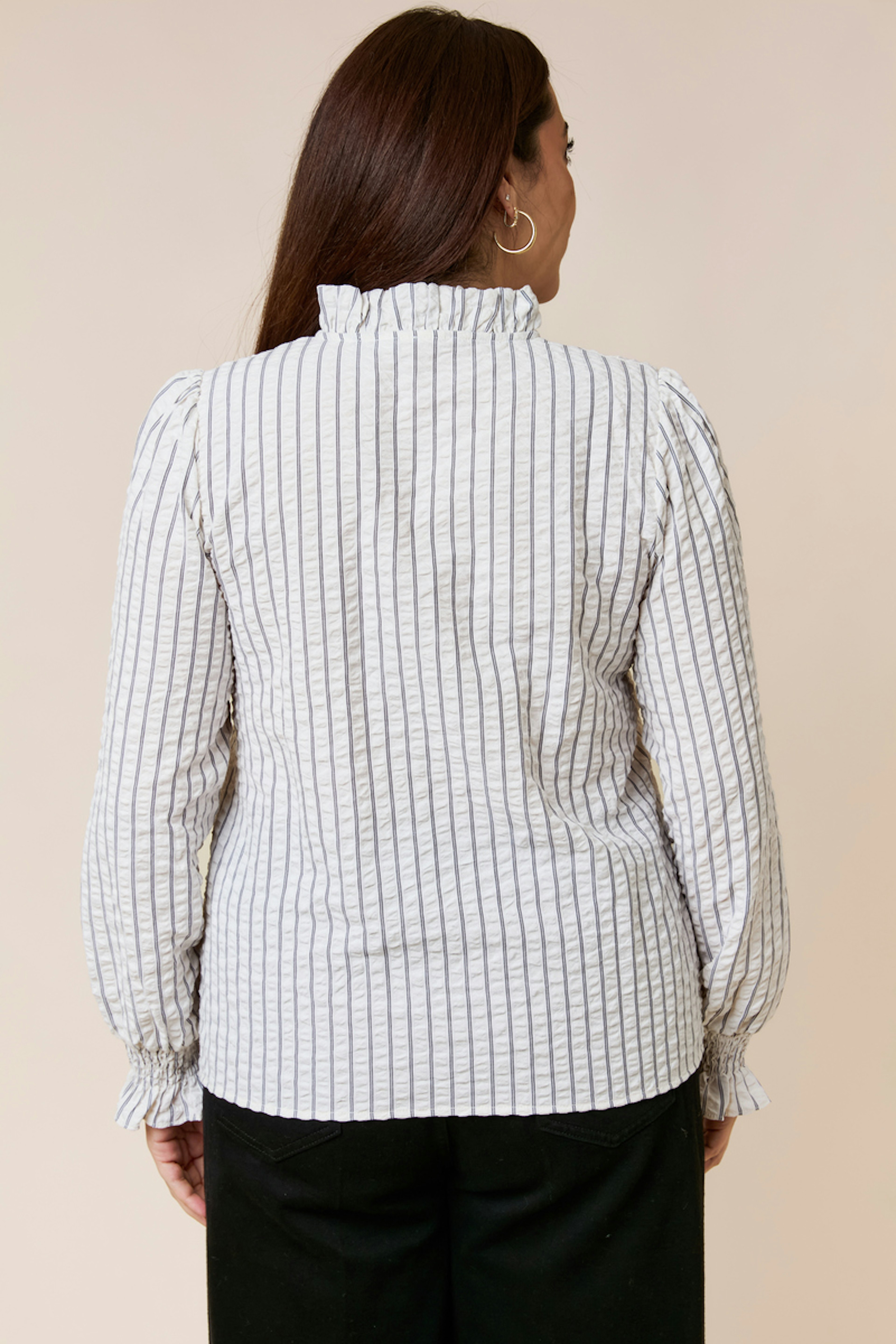 Combineer deze gestreepte blouse met een zwarte skinny jeans en laarzen voor een chique winterlook. • Gestreepte blouse • Knoopsluiting bij de hals • Lange mouwen met plooidetails • Iets ruime pasvorm • Elegante streepjes