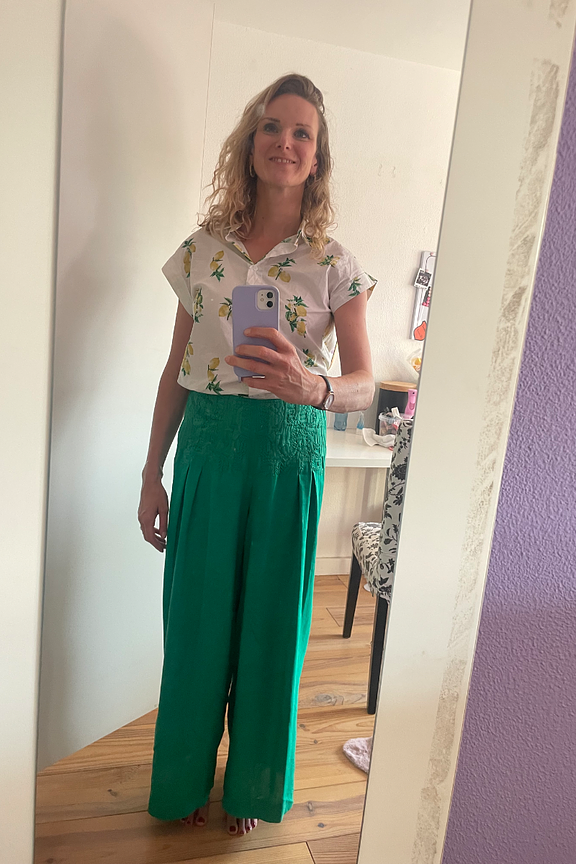 Fijne luchtige stof en leuk motiefje. Lekker zomers! Ook de combi met de broek is geweldig." "