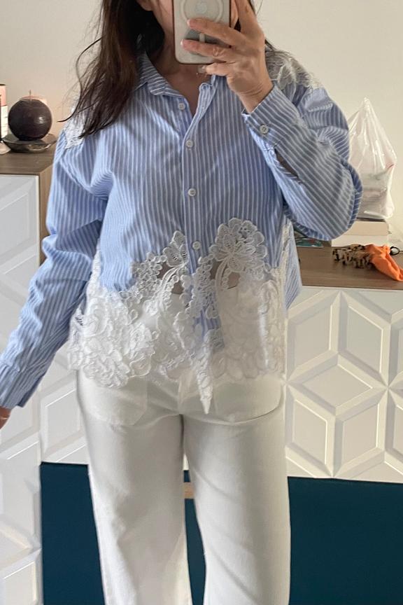 Combineer dit shirt met een broek met hoge taille voor een chique, moderne look. Ideaal voor alle seizoenen. - Shirt met kanten detail - Klassieke overhemdkraag - Lange mouwen - Vloeiend recht model - Streeppatroon