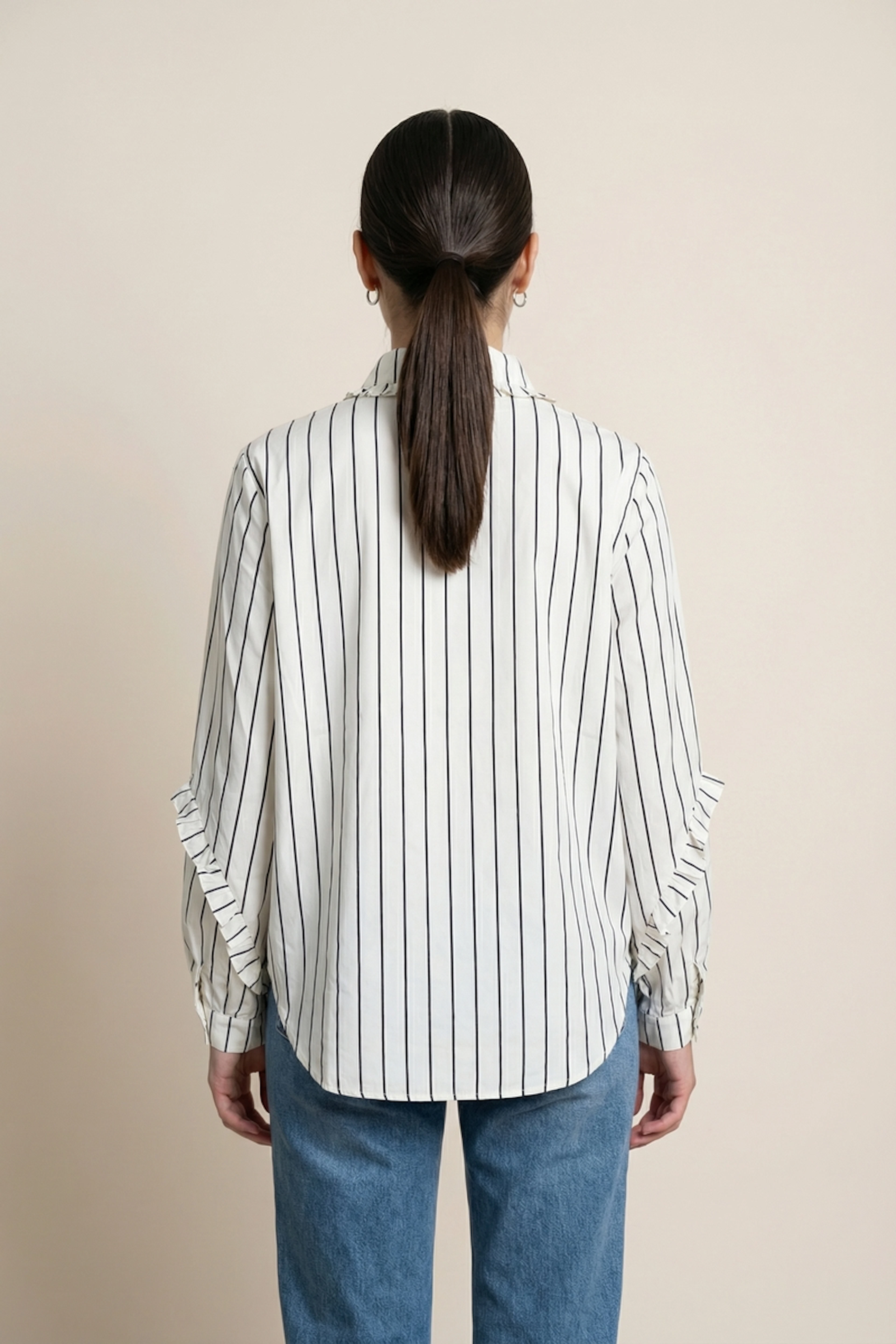 Combineer dit gestreepte overhemd met een hoge taille jeans en loafers voor een chique zomerlook. • Gestreept overhemd • Klassieke kraag • Lange mouwen • Aansluitende pasvorm • Rimpeldetails aan de manchetten