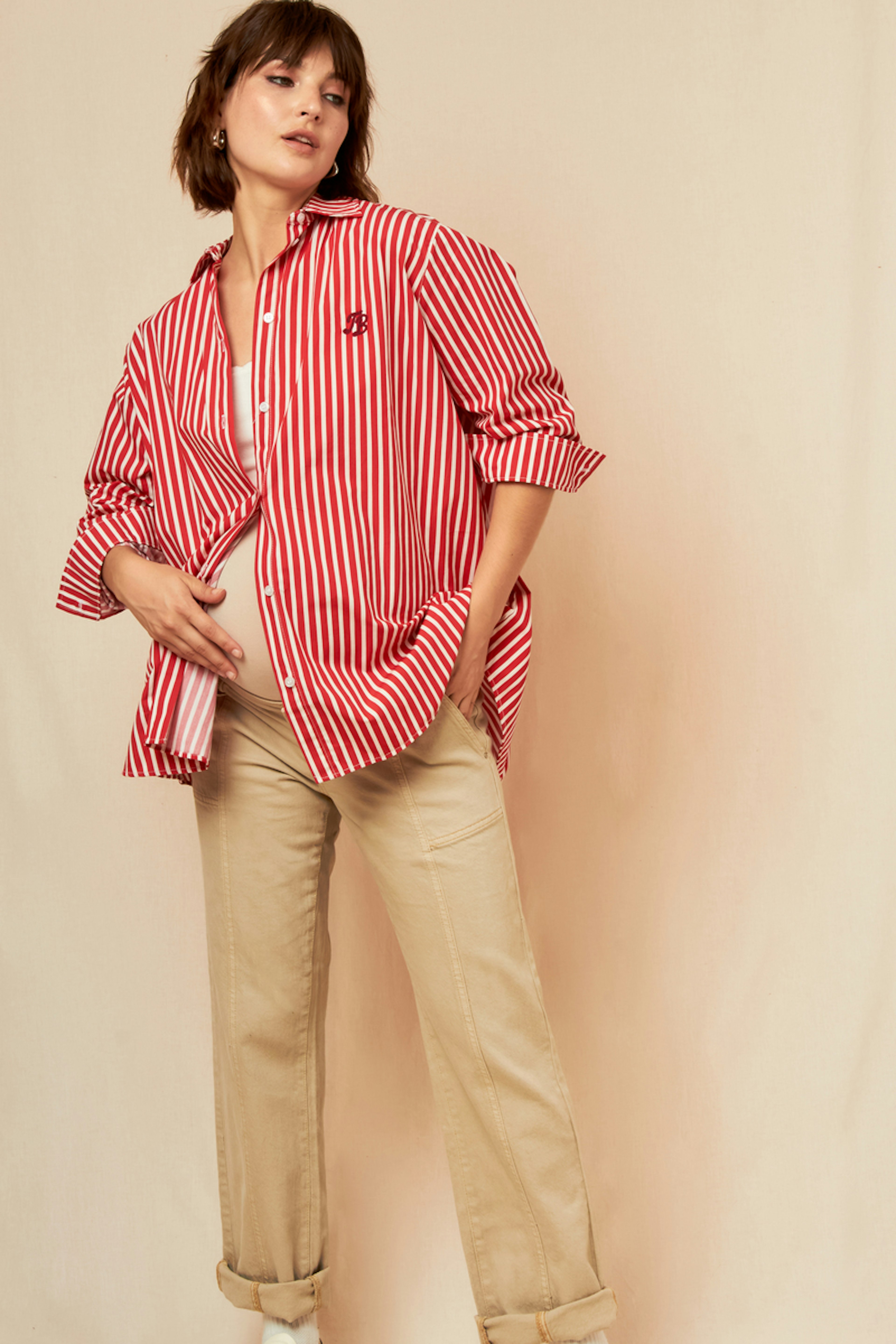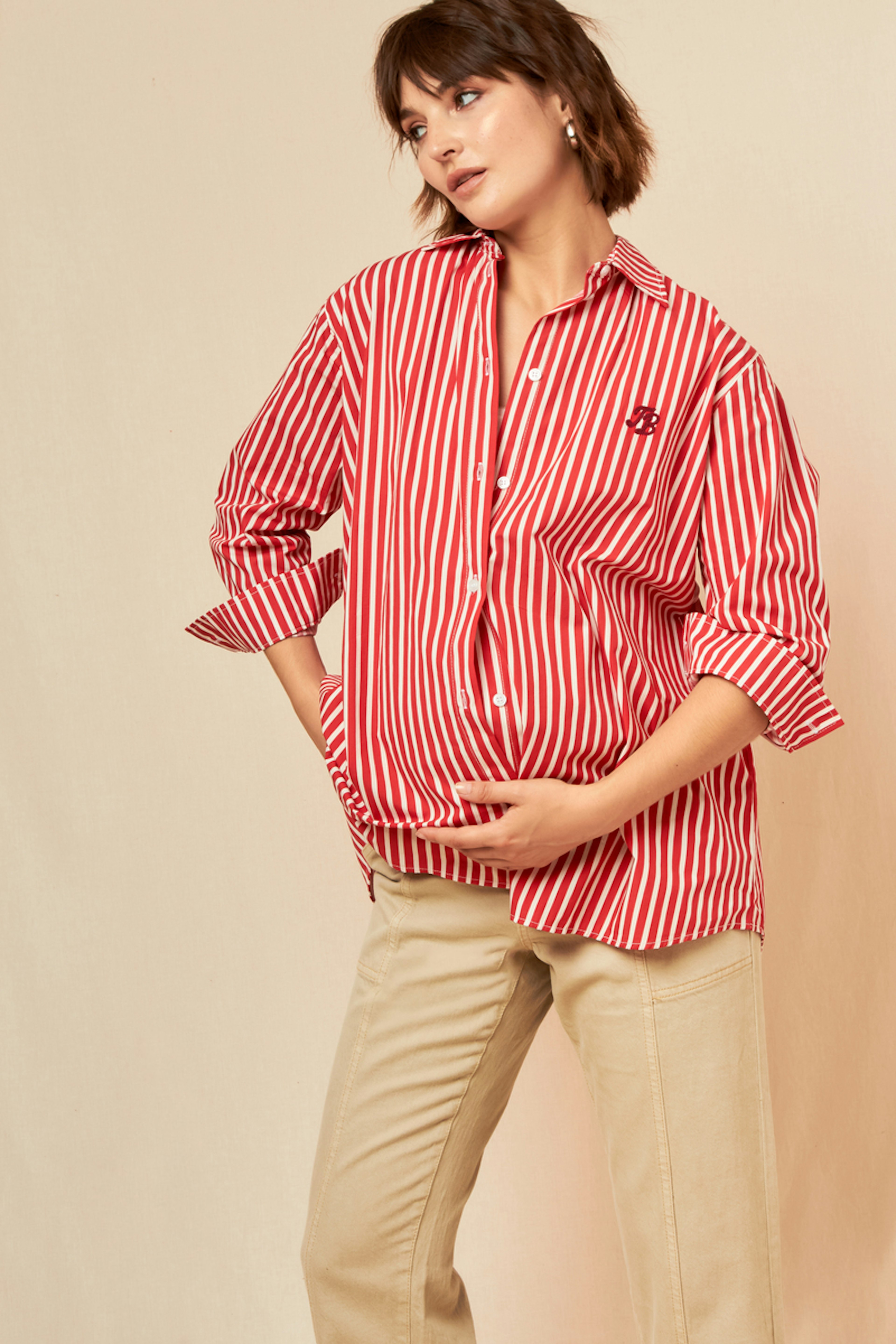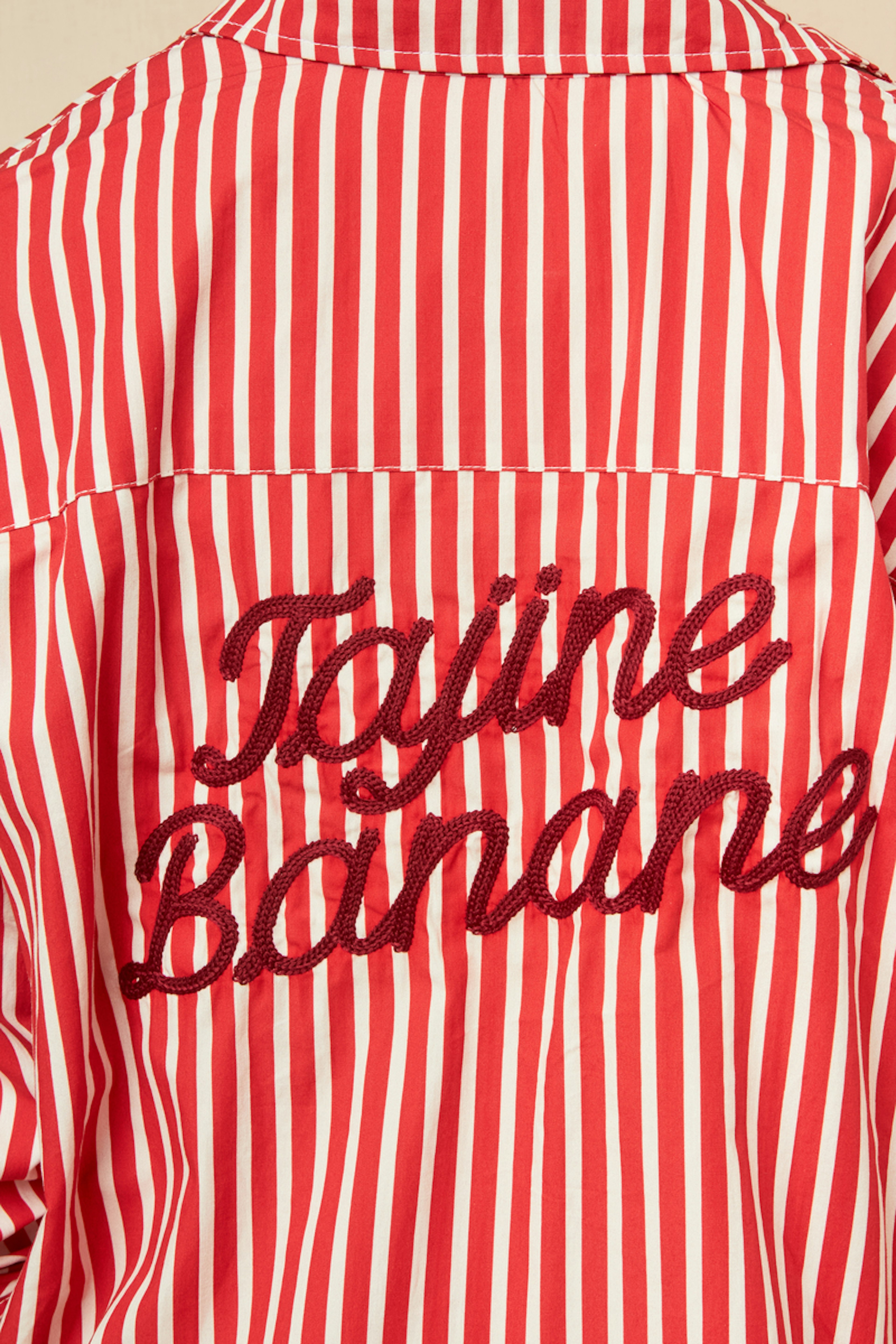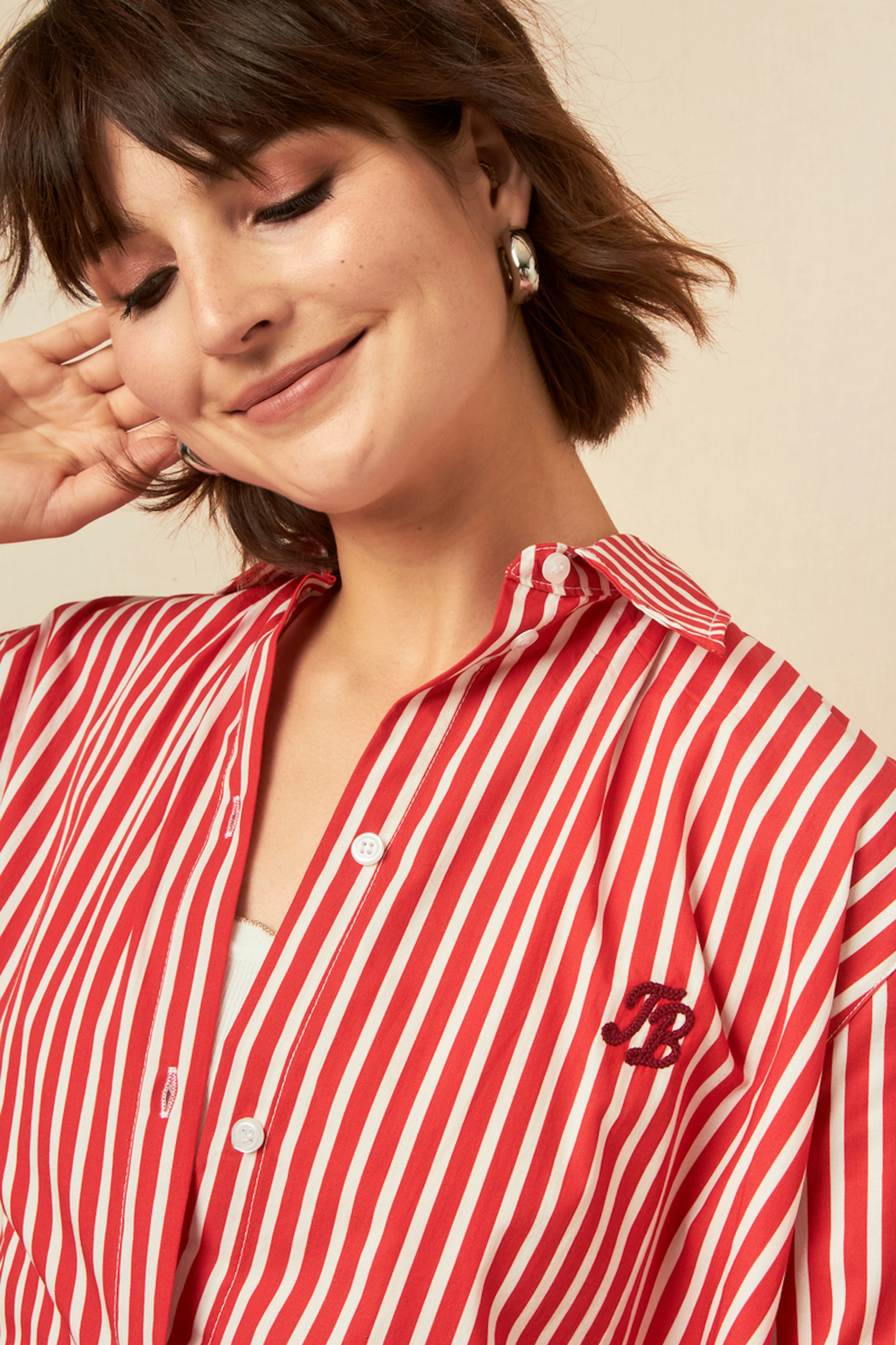 Combineer dit gestreepte shirt met een vloeiende witte broek en sandalen voor een chique, comfortabele zomerlook. - Gestreept overhemd, 100% katoen - Losse pasvorm - Lange mouwen - Overhemdkraag - Gestreept patroon