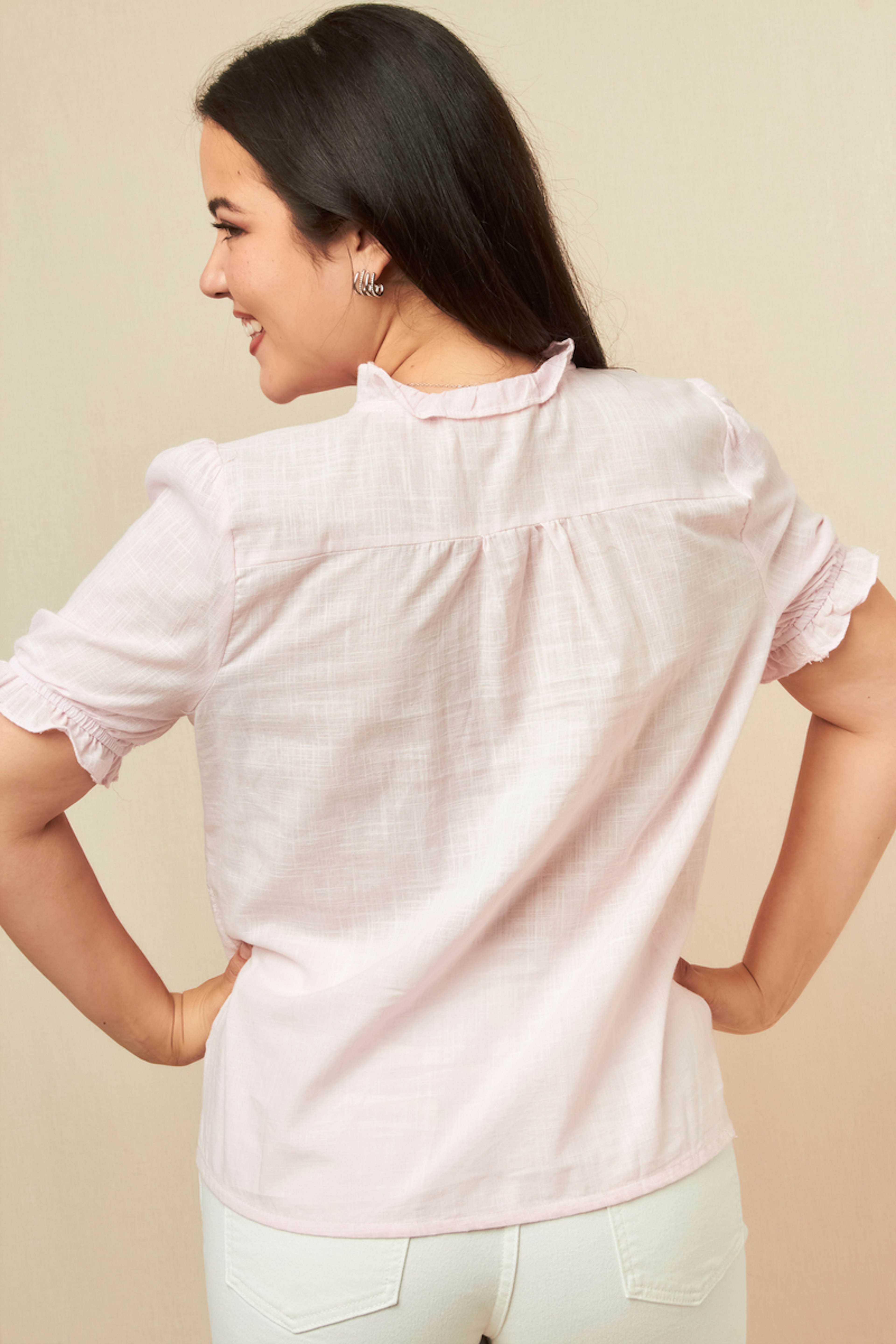 Combineer dit shirt met een witte broek en gouden sandalen voor een chique zomerse look. - Katoenen overhemd - Korte pofmouwen - Hoge kraag - Kanten detail - Knoopsluiting