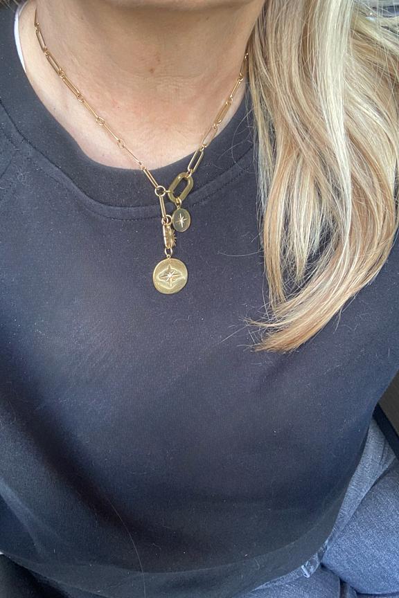 Voeg een vleugje elegantie toe met deze stainless steel ketting, perfect om een chique outfit te verfraaien of karakter te geven aan een casual look. • Fantasie ketting in stainless steel • Grote schakels • Hangers met sterpatronen • Haakslot • Moderne geometrische details