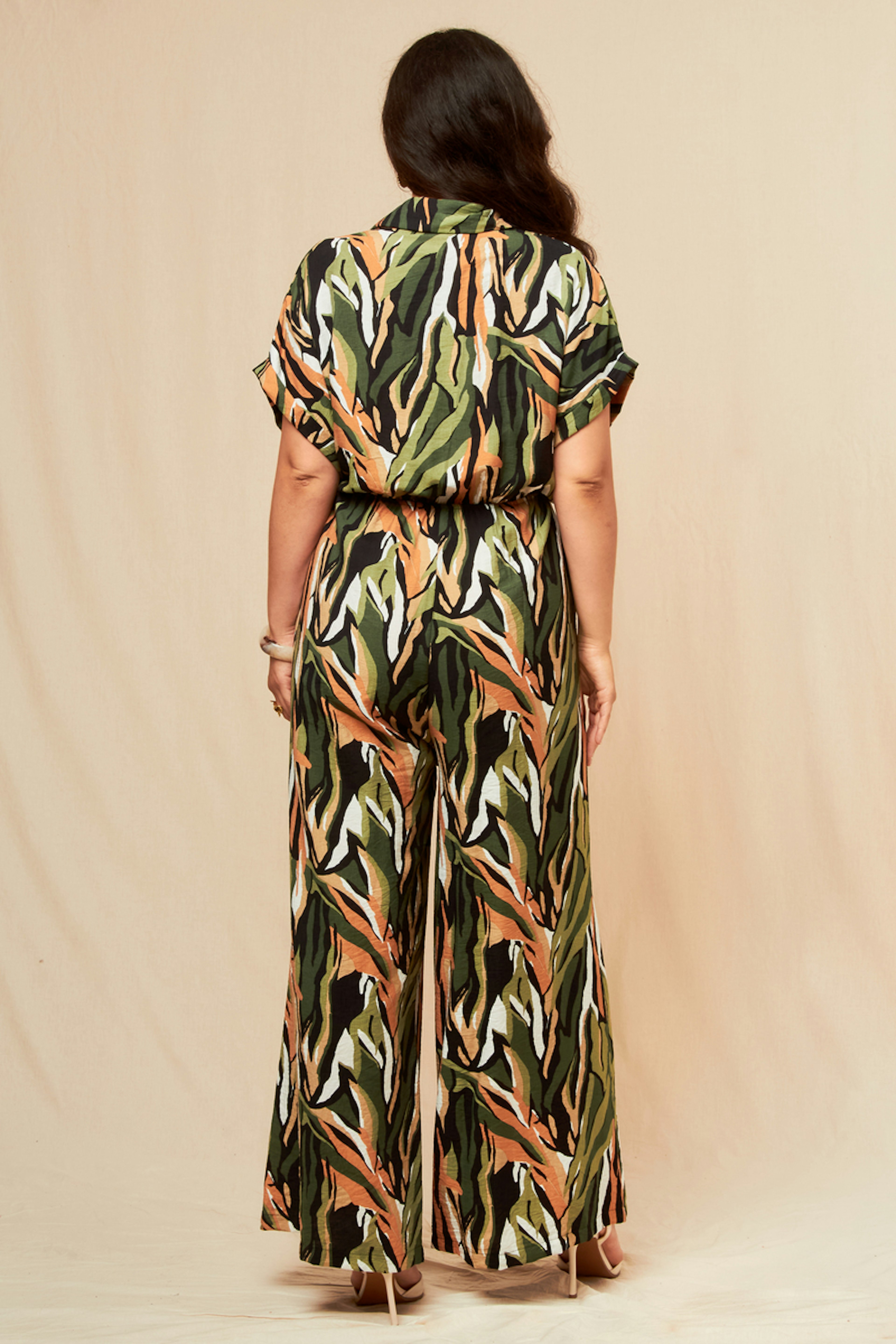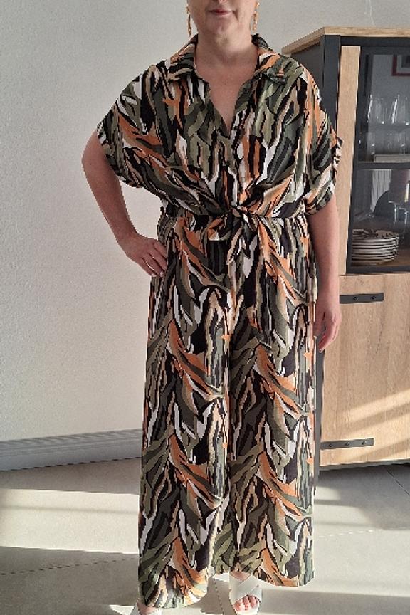 Voeg gouden hoepeloorbellen en nude sandalen toe voor een chique zomerse look. - Jumpsuit met print - Korte mouwen - Ceintuur in taille - Vloeiende vorm - Overhemd kraag