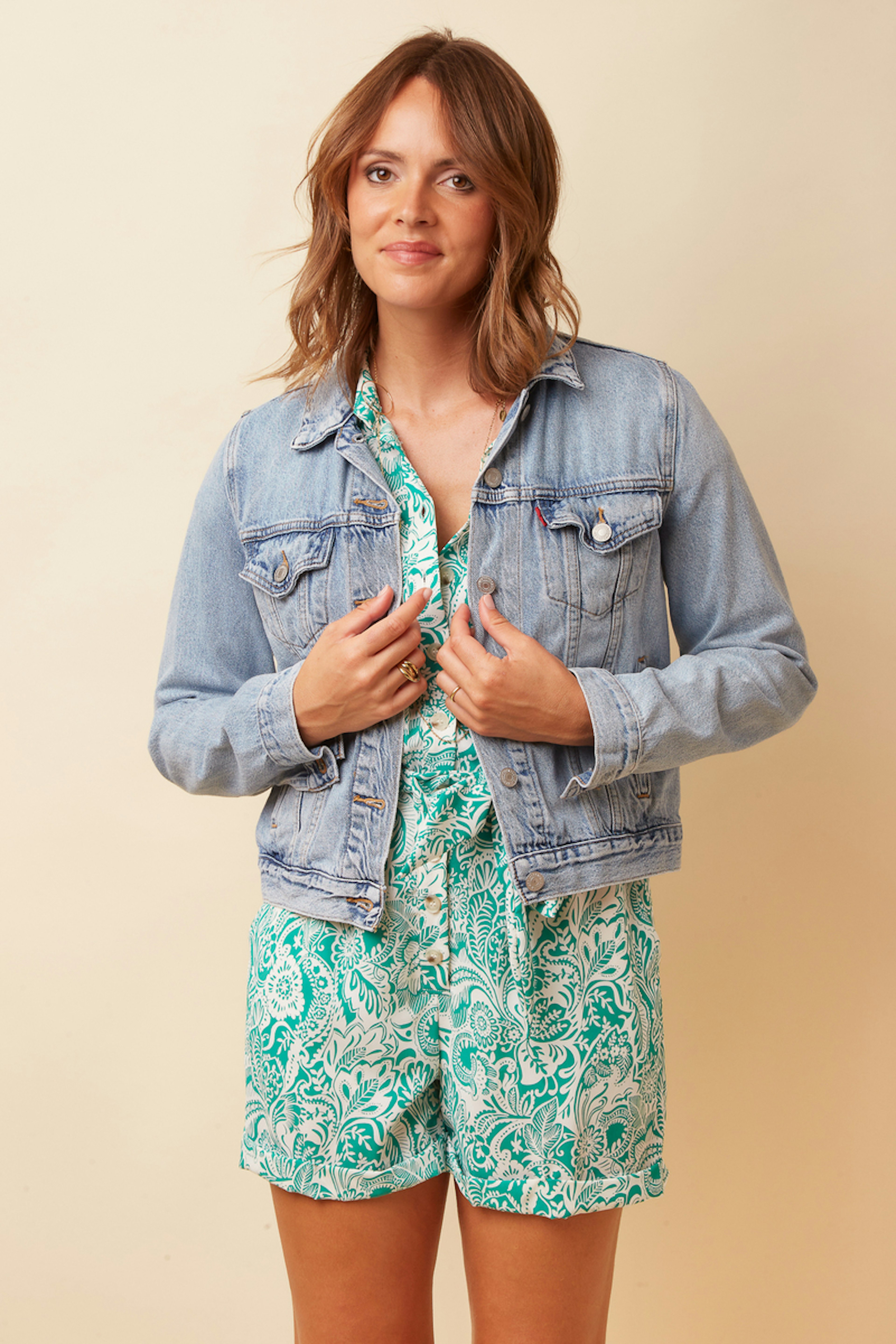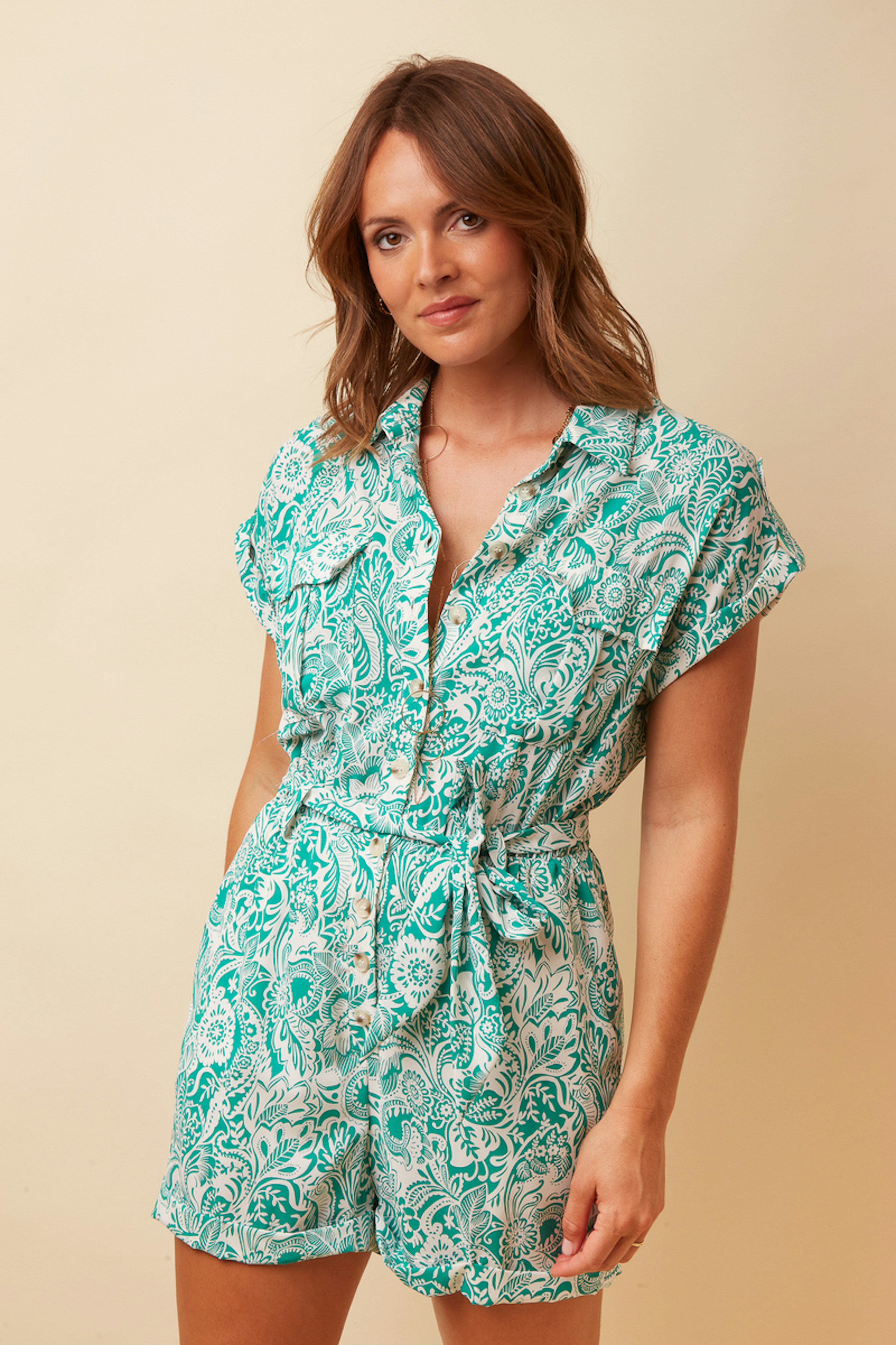 Combineer deze korte jumpsuit met nude sandalen voor een frisse, lichte zomerlook, perfect voor warme zomerdagen. - Korte jumpsuit - Overhemdkraag - Korte mouwen - Strikceintuur - Bloemenmotief
