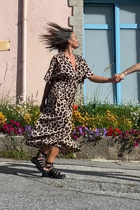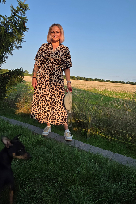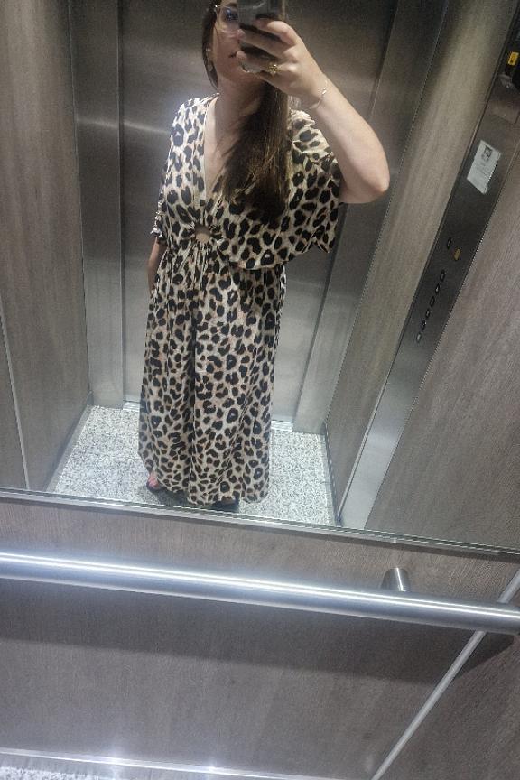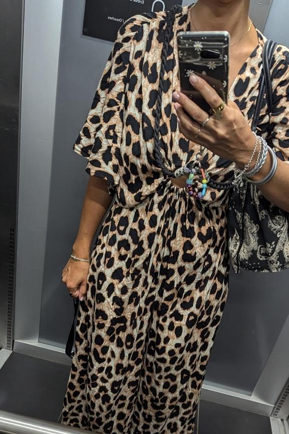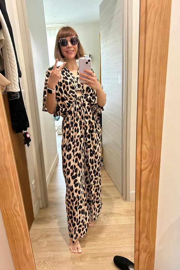 Deze jumpsuit met opvallende print is perfect voor zomerse dagen op kantoor. Combineer het met sandalen met hak en gouden accessoires voor een smart-casual look. Perfect voor de zomer - jumpsuit met luipaardprint 100% viscose - Elastische taille met uitgesneden voorkant - Losse korte mouwen - Wijde, vloeiende pijpen