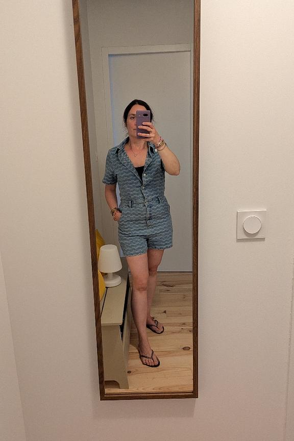 Voeg een paar nude sandalen en een rieten tas toe voor een casual zomerlook. - Katoenen jumpsuit - Korte, slanke pasvorm - Klassieke overhemdkraag - Korte mouwen - Elegant structuurpatroon