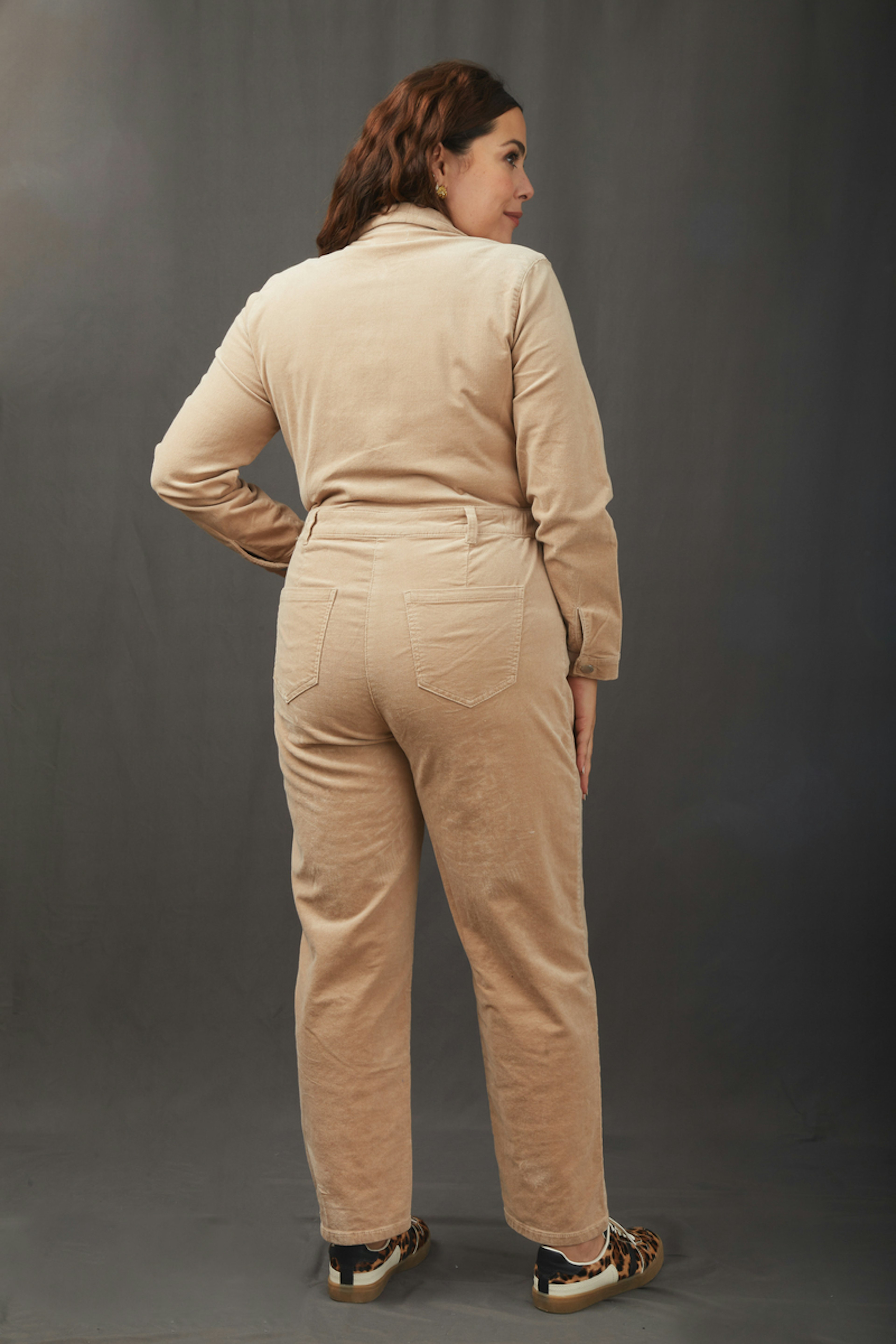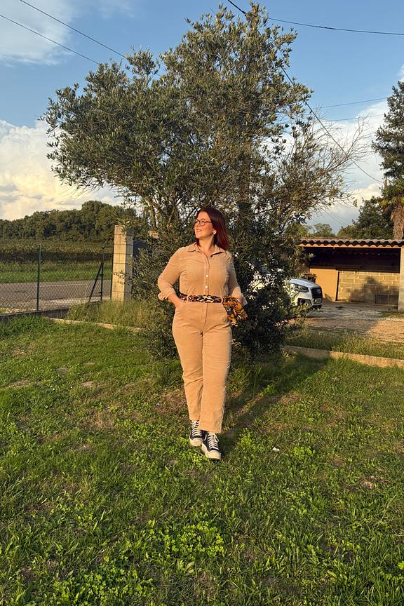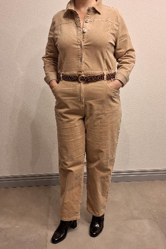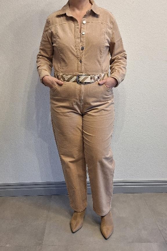Combineer deze beige fluwelen jumpsuit met witte gympen voor een casual look of enkellaarsjes met hak voor een chique touch. Perfect voor alle seizoenen. - Corduroy jumpsuit - Recht model - Lange mouwen - Overhemdkraag - Knoopsluiting aan de voorkant