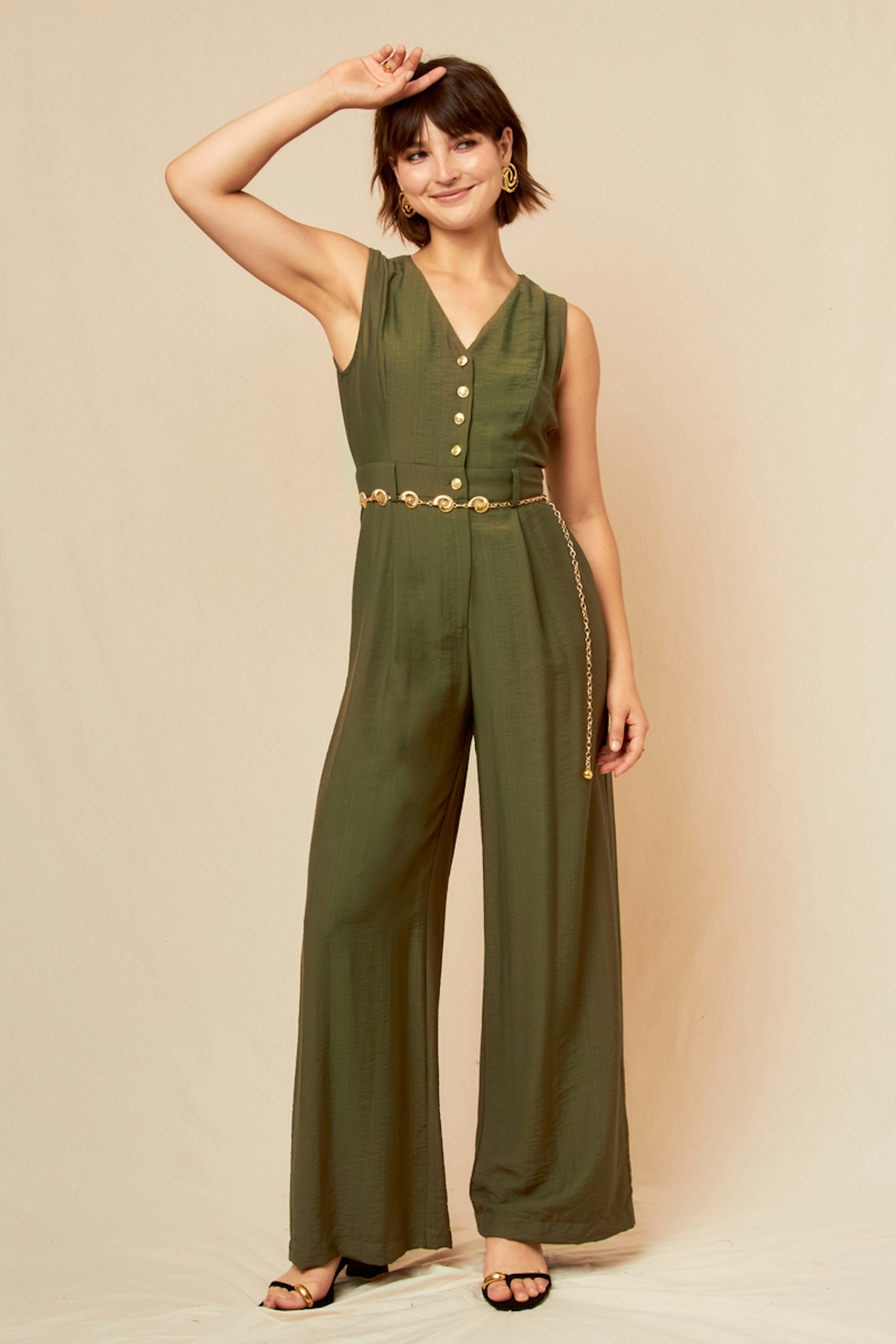 Combineer deze elegante kaki jumpsuit met gouden sandalen en opvallende oorbellen voor een vleugje zomerse chic. - Soepele jumpsuit van viscose - Flatterende V-halslijn - Mouwloos voor extra frisheid - Wijde pijpen voor optimaal comfort - Verfijnde gouden knopen