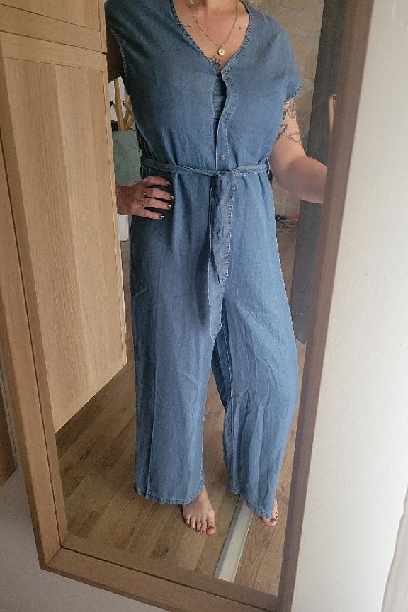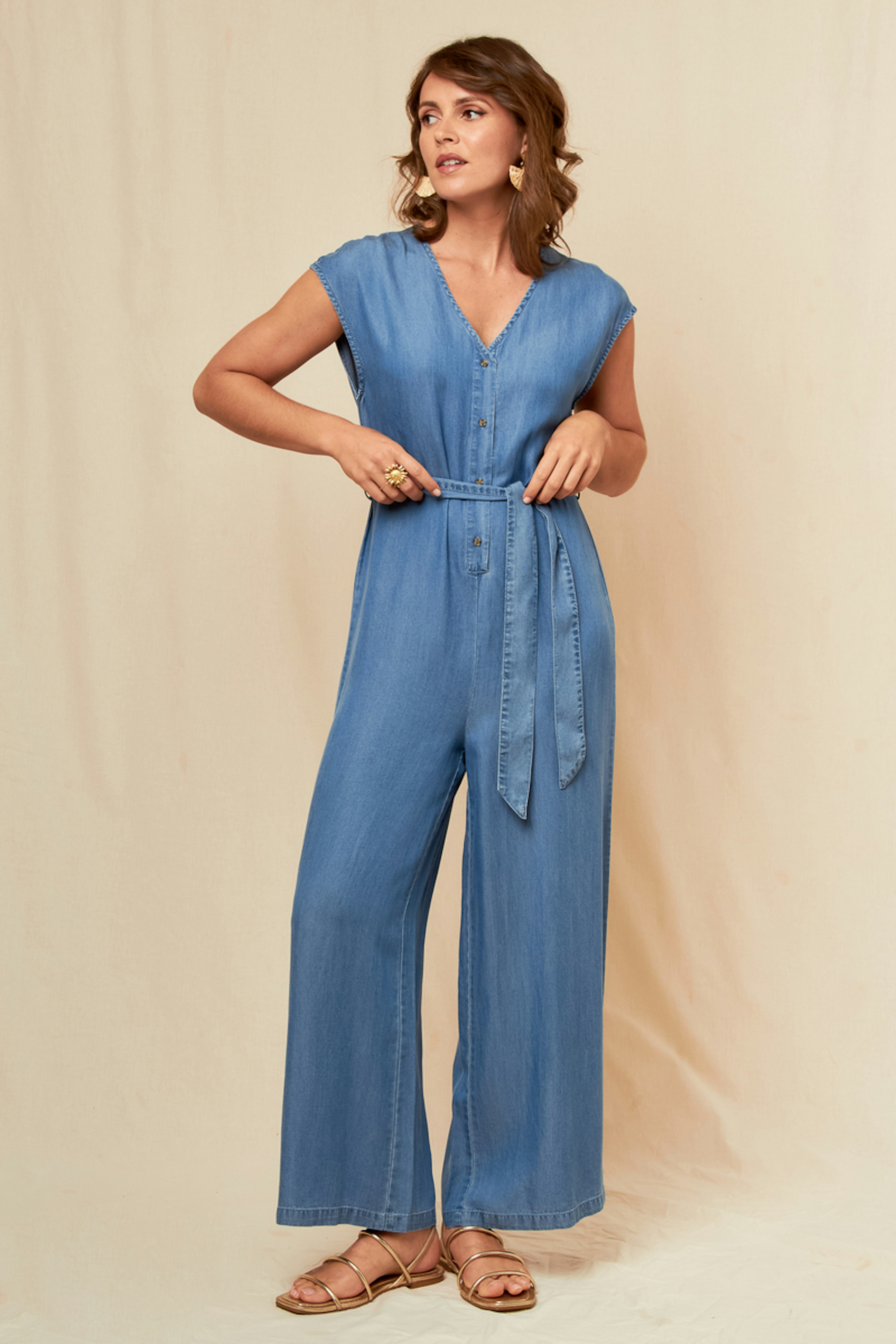 Combineer deze vloeiende jumpsuit met gouden sandalen en een strooien hoed voor een relaxte zomerlook. - Jumpsuit van lyocell - V-hals - Korte mouwen - Wijde pasvorm - Strikceintuur