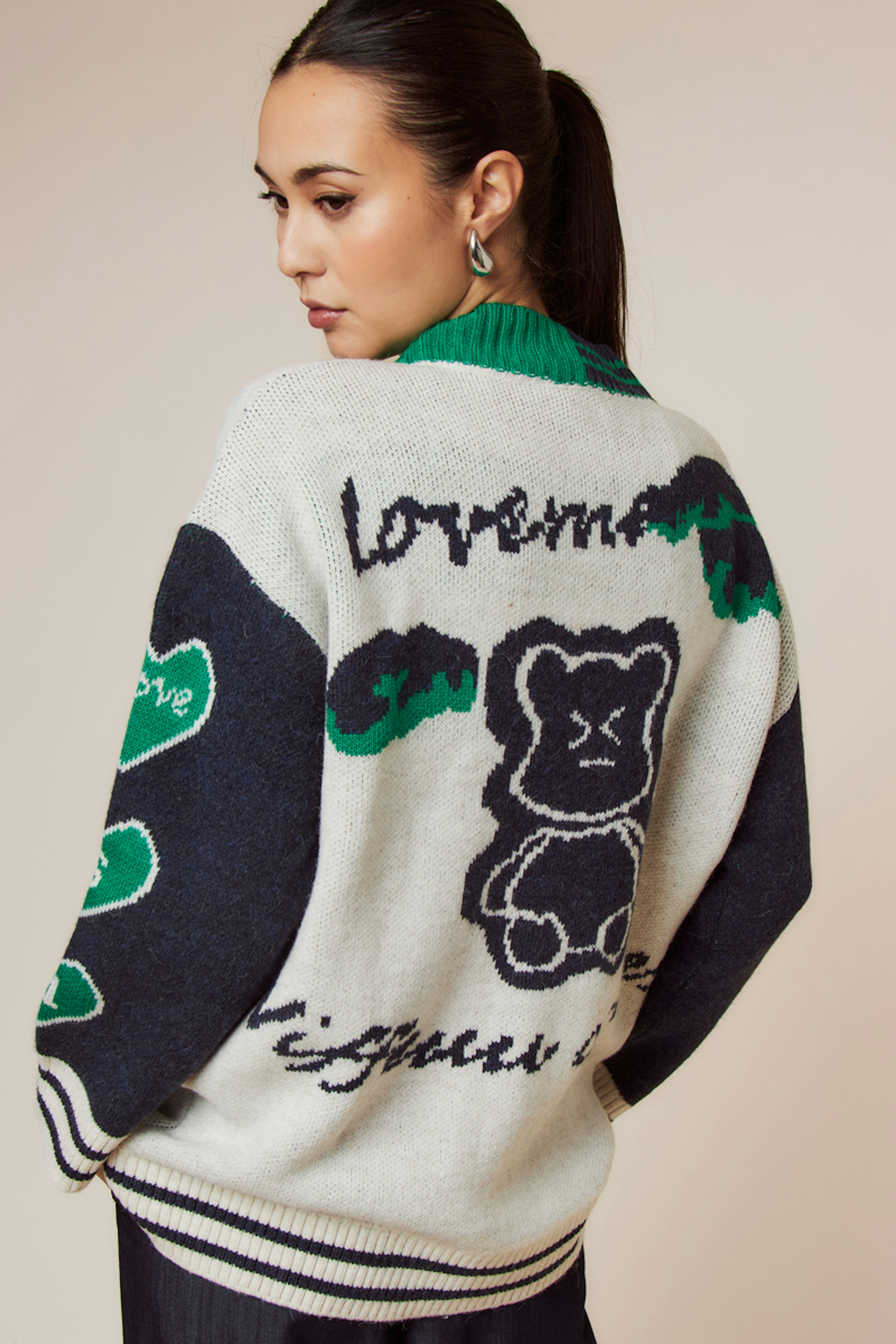 Combineer dit vest met een hoge taille broek en enkellaarsjes voor een chique en casual winterlook. • Vest met wol • Lange mouwen • V-hals • Knopsluiting • Letter- en streeppatroon
