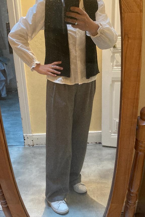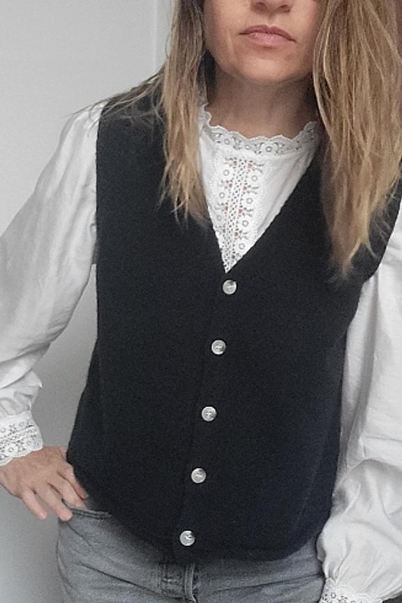Eigenlijk een mooie vest. I zou naar mijn mening echter beter zijn met gouden knopen, omdat het anders snel als 'grijs muisje' overkomt." "