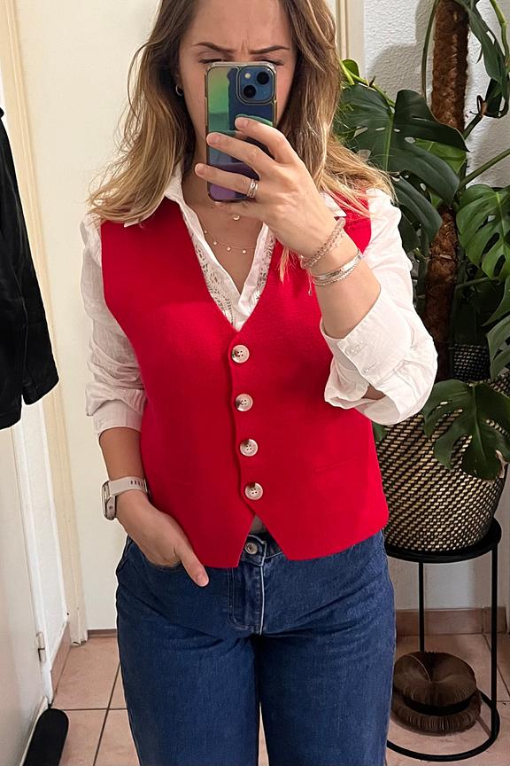 Kies voor tijdloze elegantie met ons mouwloze vest versierd met gouden Maya knopen. Dit veelzijdige vest is een perfecte aanvulling op je garderobe, zowel voor een casual dag als een elegante avond uit. De flatterende pasvorm en geraffineerde details maken het een chique en comfortabele keuze. - Rood mouwloos vest - Recht model - Gouden knoopsluiting - Twee zakken aan de voorkant - Mao kraag - Een maat past 34 tot 40