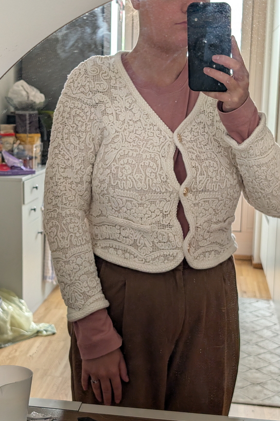 Mooi vest maar valt echt klein, en kan niet gesloten worden gedragen, zelfs niet door mijn dochter die maat 38 heeft omdat het tussen de knopen open staat" "