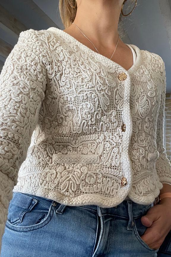 Combineer dit kanten vest met een flare jeans en pumps voor een chique zomerse look. - Katoenen vest - V-hals - Lange mouwen - Gouden knopen - Verfijnd kantpatroon
