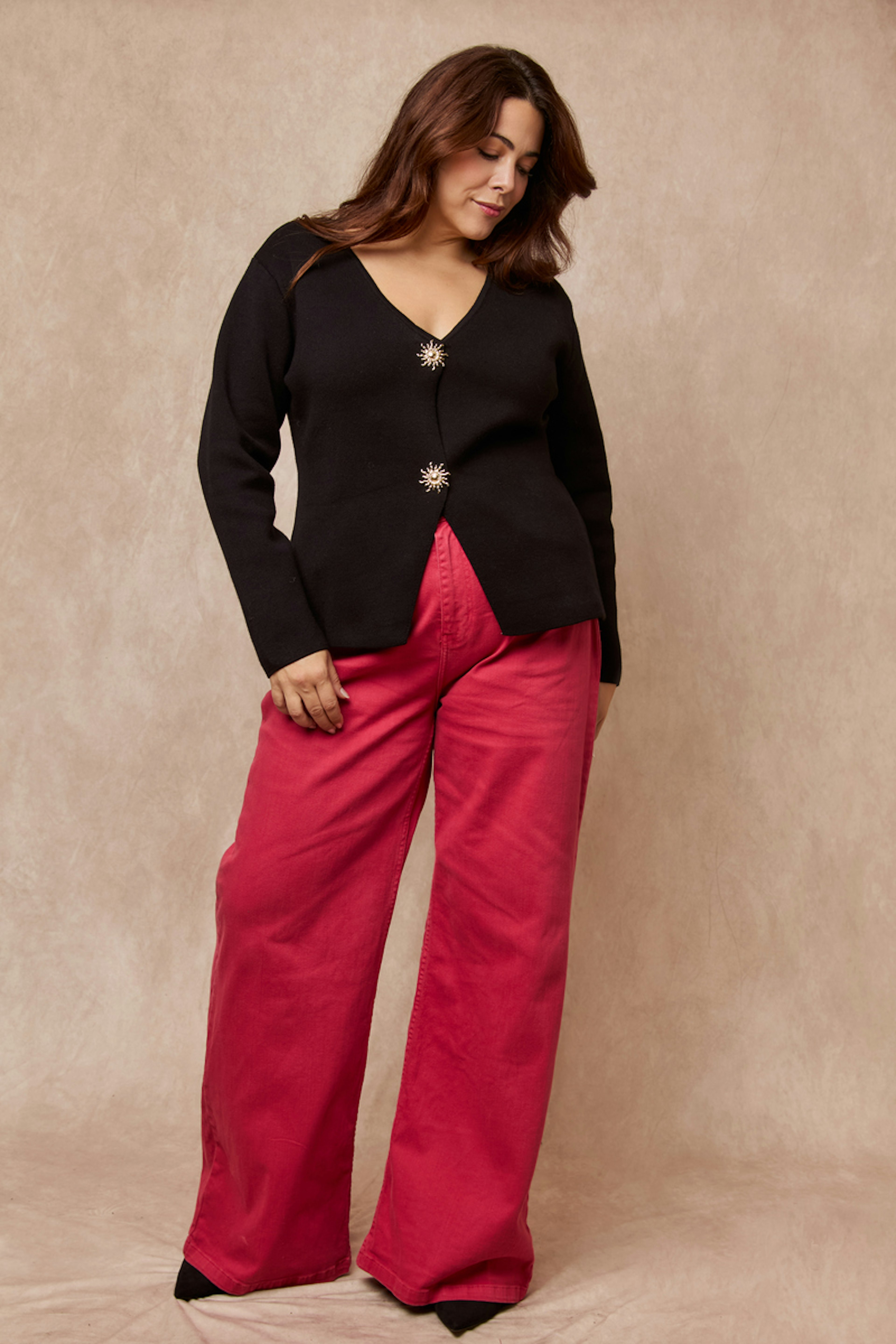 Verhoog deze chique vest door het te combineren met hoge taille jeans en leren enkellaarsjes. Ideaal in de winter voor een elegante en comfortabele look. • Zwarte gilet • Aansluitende pasvorm • V-hals • Sluiting met versierde knopen • Lange mouwen